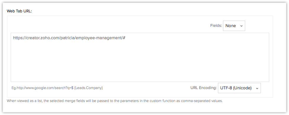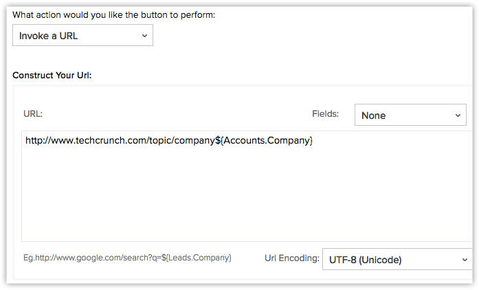 Vizitează profilurile companiilor Lead-urilor tale din Zoho CRM: Toate contactele din contul tău pot avea un câmp unde specifici Numele companiei. Prin crearea unui URL care este asociat cu o anumită companie, poți merge direct la profilul companiei contului doar apăsând butonul personalizat (Acest buton personalizat poate fi plasat la crearea, clonarea sau vizualizarea unei înregistrări, în funcție de cerințele tale). De exemplu: Linkul poate fi: http://techcrunch.com/topic/company/$%7BAccounts.Company }