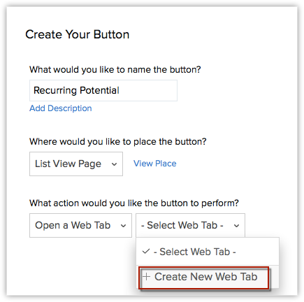 Alege Open a web tab ca acțiune a butonului tău, care permite deschiderea unui web tab într-un tab nou împreună cu câmpurile de îmbinare asociate, printr-un singur clic de buton. Poți fie să creezi un web tab nou, fie să alegi din lista de web tab-uri deja create și să le asociezi butonului tău personalizat.