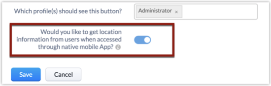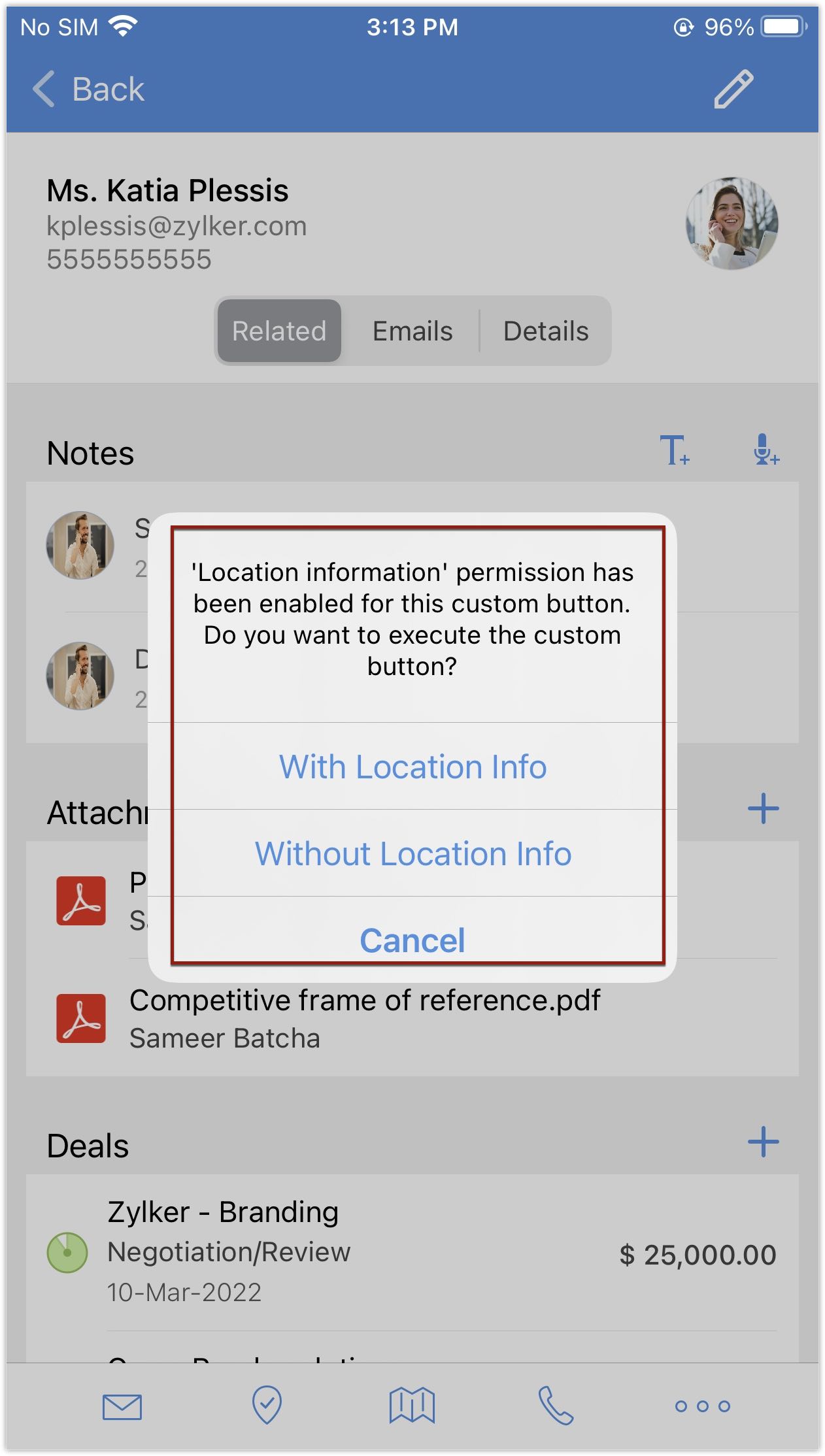 - Dacă utilizatorul aplicației mobile nu a activat serviciile de locație pe telefonul său, Zoho CRM îl va solicita mai întâi să activeze serviciile de locație pe dispozitiv și apoi va solicita ulterior consimțământul pentru urmărirea locației prin butonul personalizat.