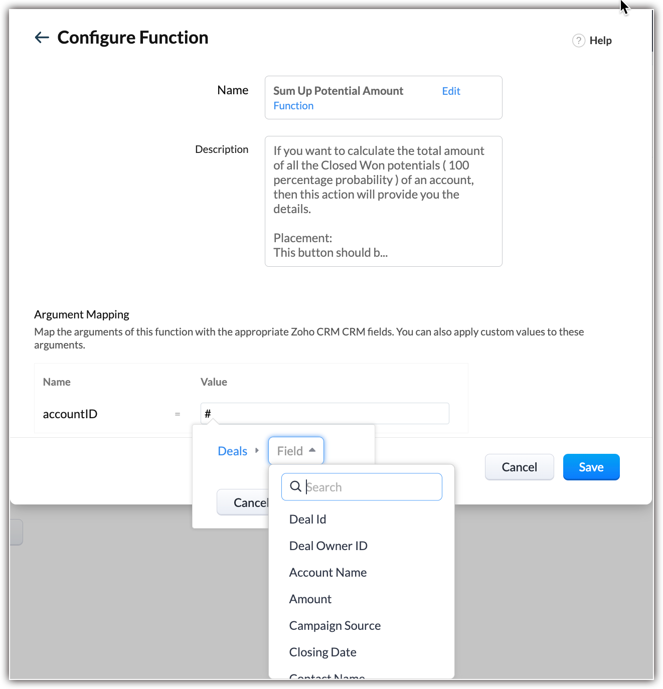 Maparea valorilor legate de modul : Alege numele modulului din lista derulantă pentru a mapa câmpurile acelui modul. De exemplu, în timp ce configurezi un buton personalizat pentru modulul Contacts, vei putea găsi modulul Contacts și modulele sale de tip lookup, dacă există, cum ar fi Accounts, Vendors, etc. Dacă alegi Contacts din lista derulantă, vei putea mapa în continuare câmpurile sale, cum ar fi Contact id, Contact Owner id , etc.