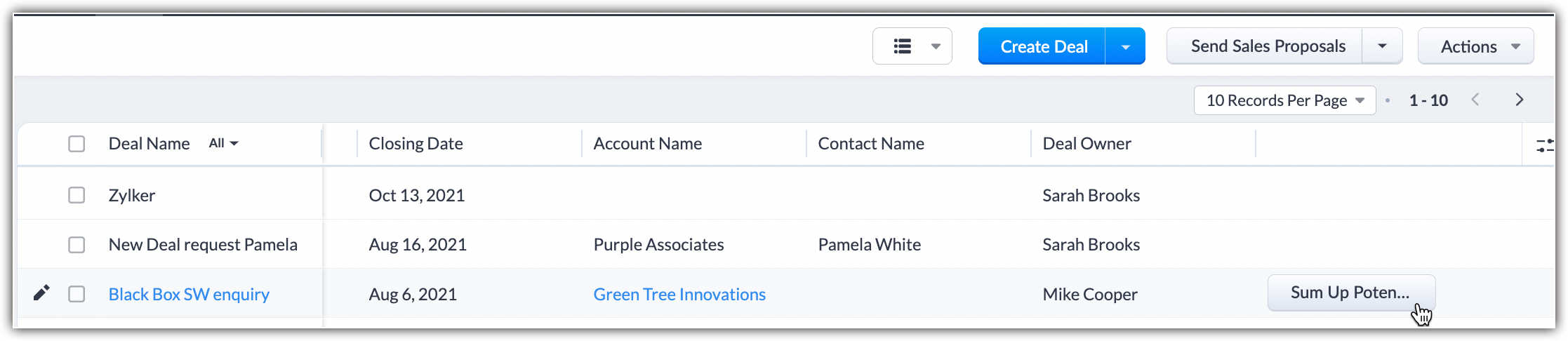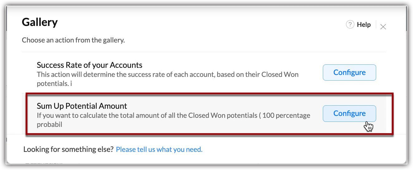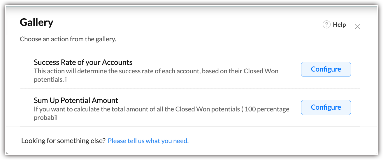 Zoho CRM îți oferă câteva acțiuni de buton gata de implementat în galerie, care pot fi asociate cu un buton personalizat pentru diferite scenarii de afaceri ori de câte ori este necesar.