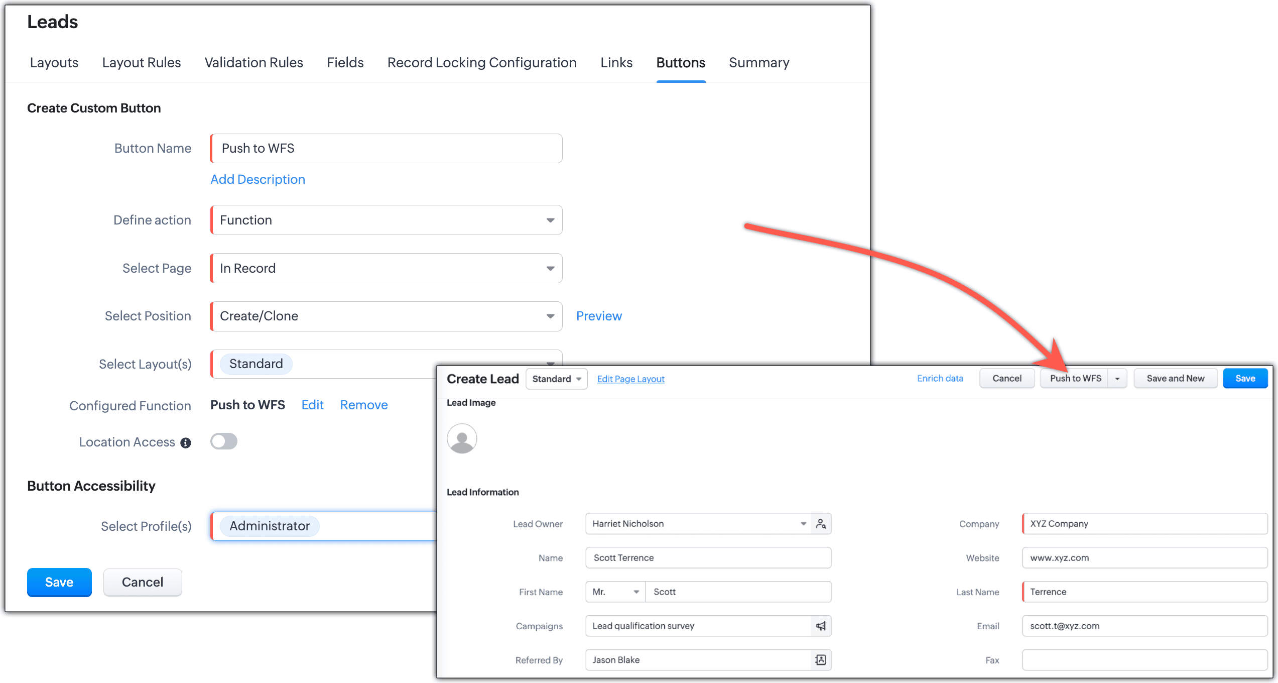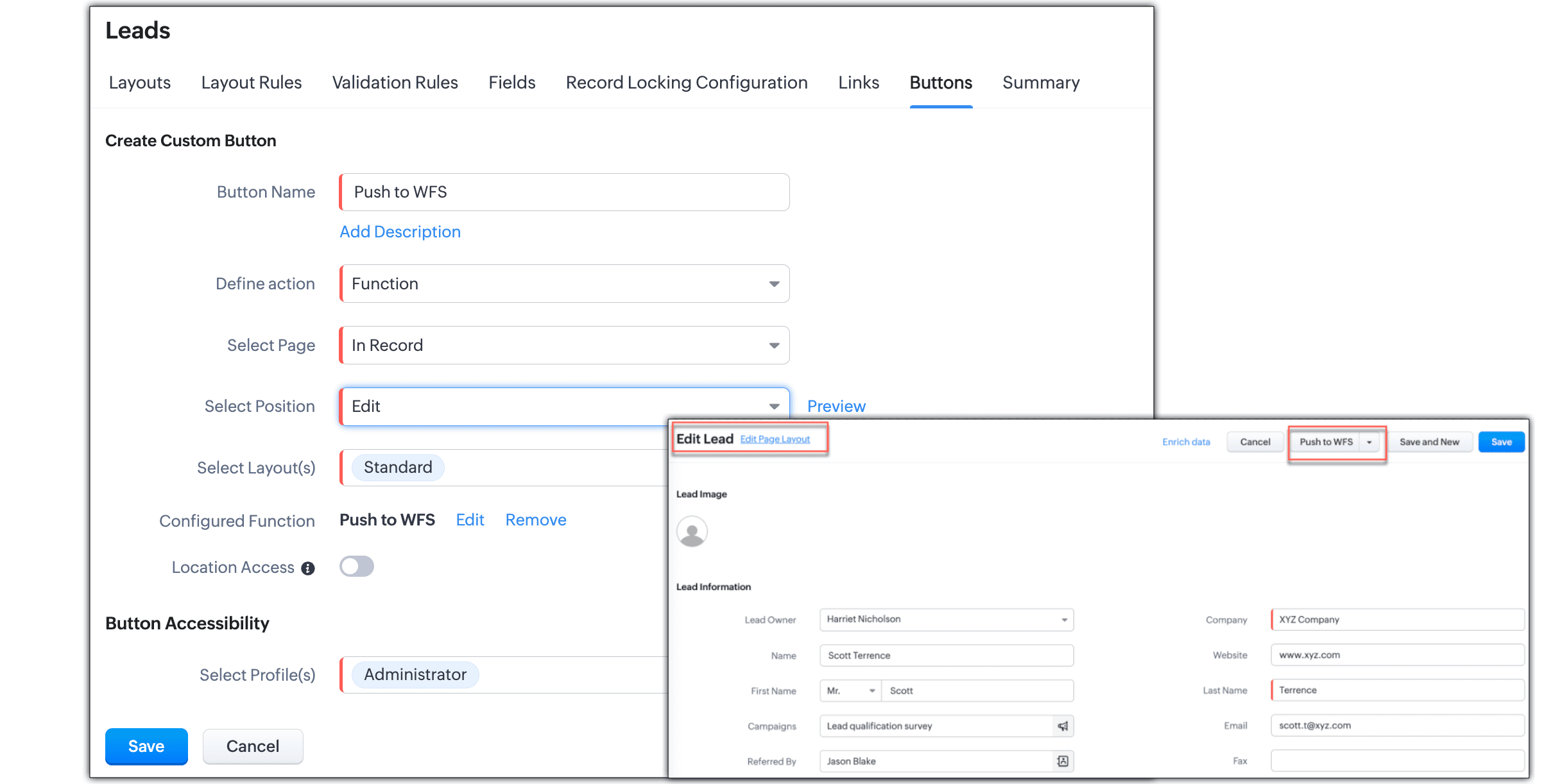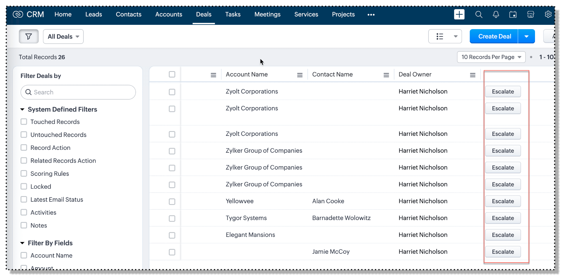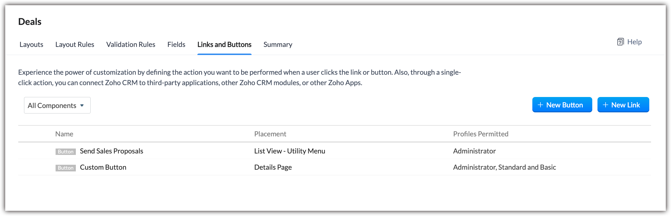 Zoho CRM are butoane standard care sunt utilizate pentru a executa diverse acțiuni predefinite. De exemplu, Conversie este un buton standard folosit pentru a converti un Lead în Contact, Cont sau Oportunitate. Similar, Clonare este un alt buton standard care este folosit pentru a clona orice înregistrare din contul tău CRM. De asemenea, Administratorii CRM pot crea butoane noi și defini un set de acțiuni în funcție de cerințele lor . Butoanele personalizate din Zoho CRM pot fi utilizate pentru a conecta CRM-ul tău cu aplicații terțe, pentru a conecta diferite module Zoho CRM sau pentru a te conecta cu alte aplicații Zoho.