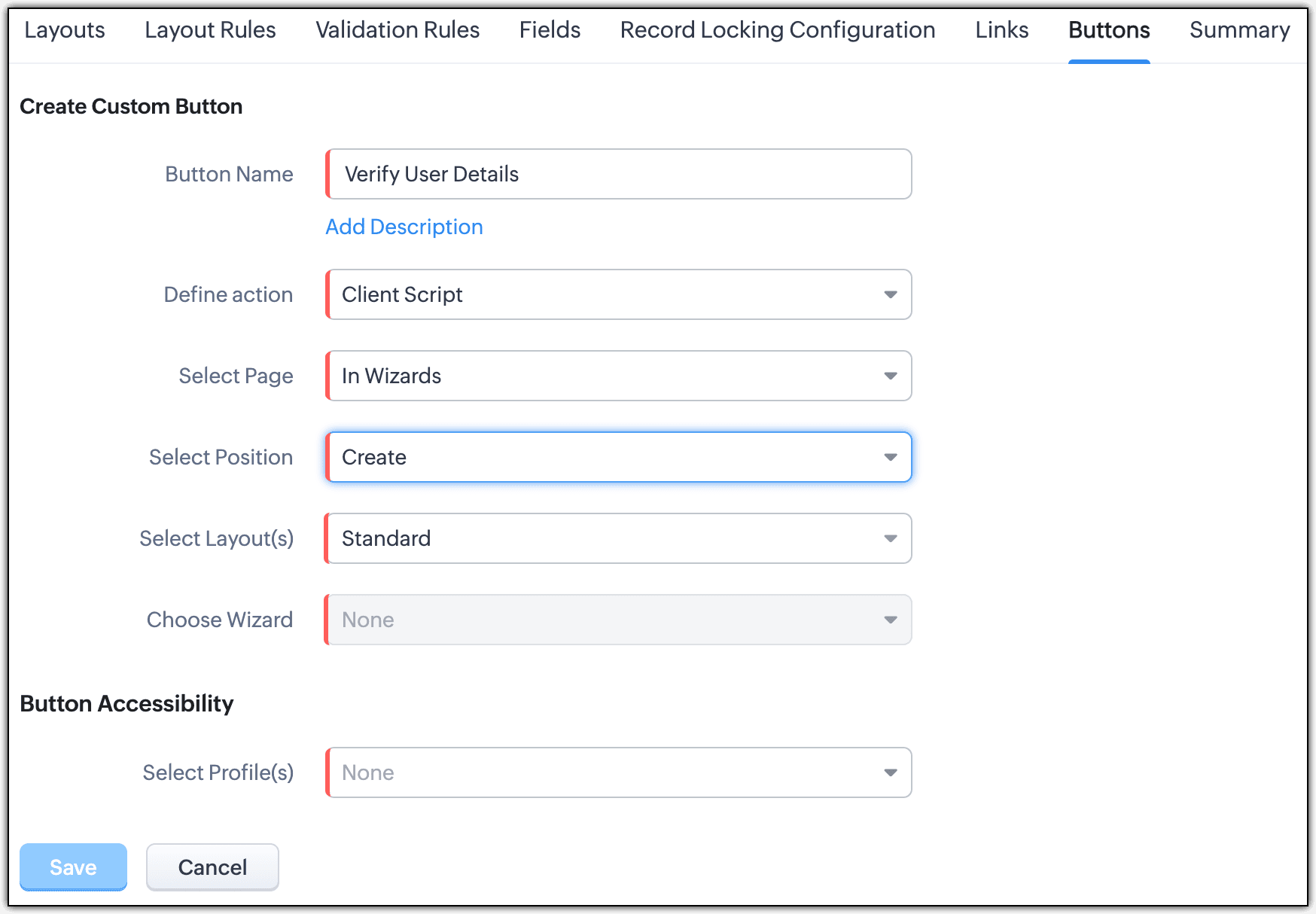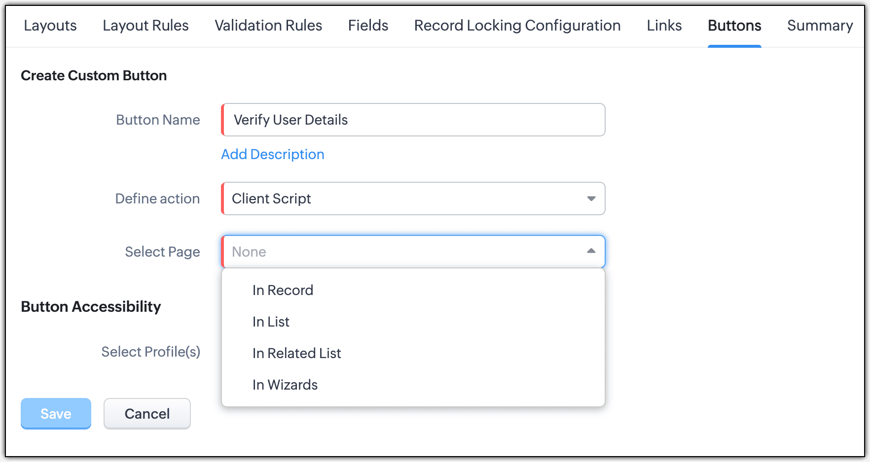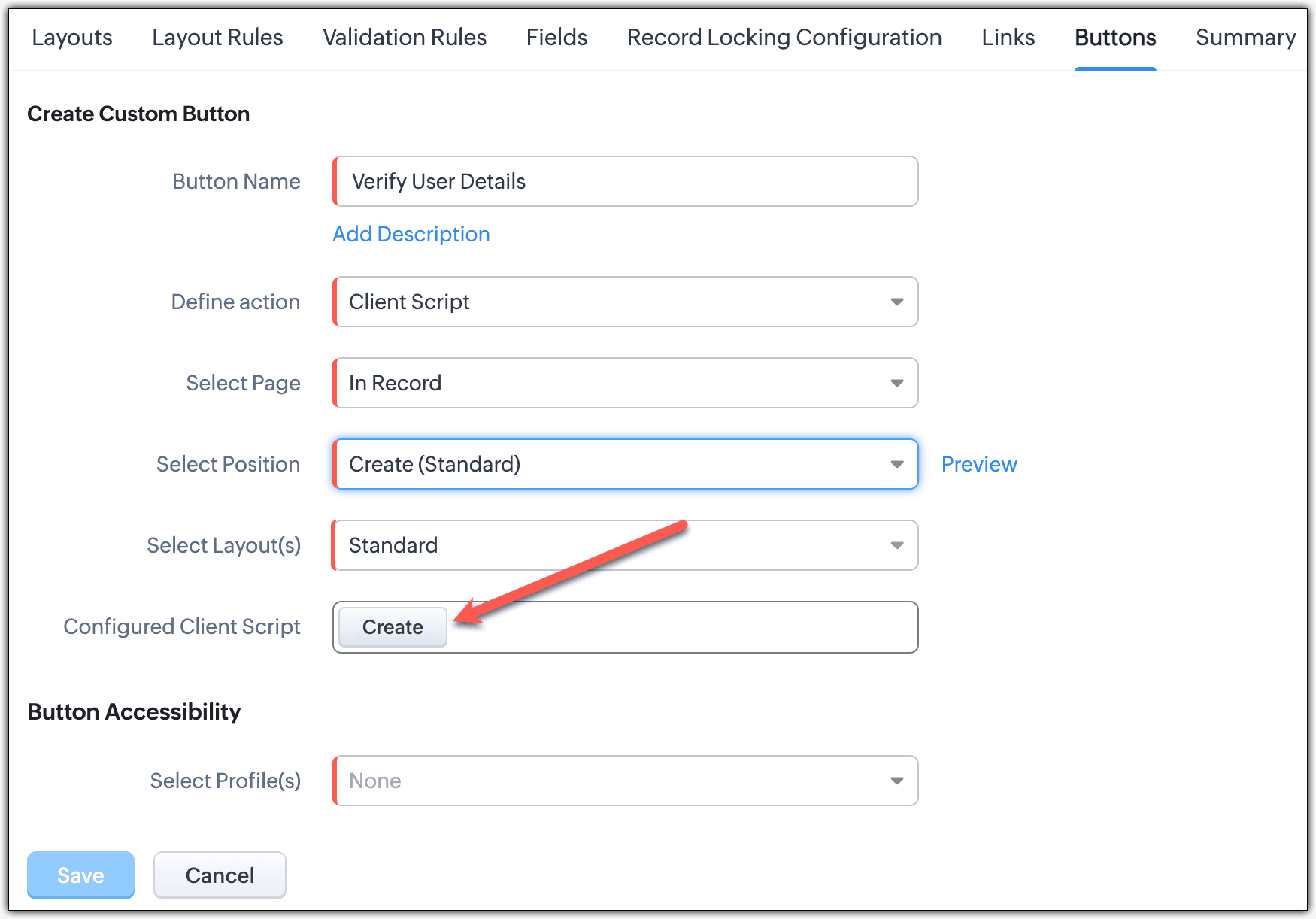 Să presupunem că vrei să verifici detaliile utilizatorului de fiecare dată când un contact este creat; poți configura un client script pentru aceasta și să îl plasezi ca buton de acțiune "Verify User Details" în modulul tău. Urmează pașii de mai jos pentru a configura același lucru în butoanele personalizate.