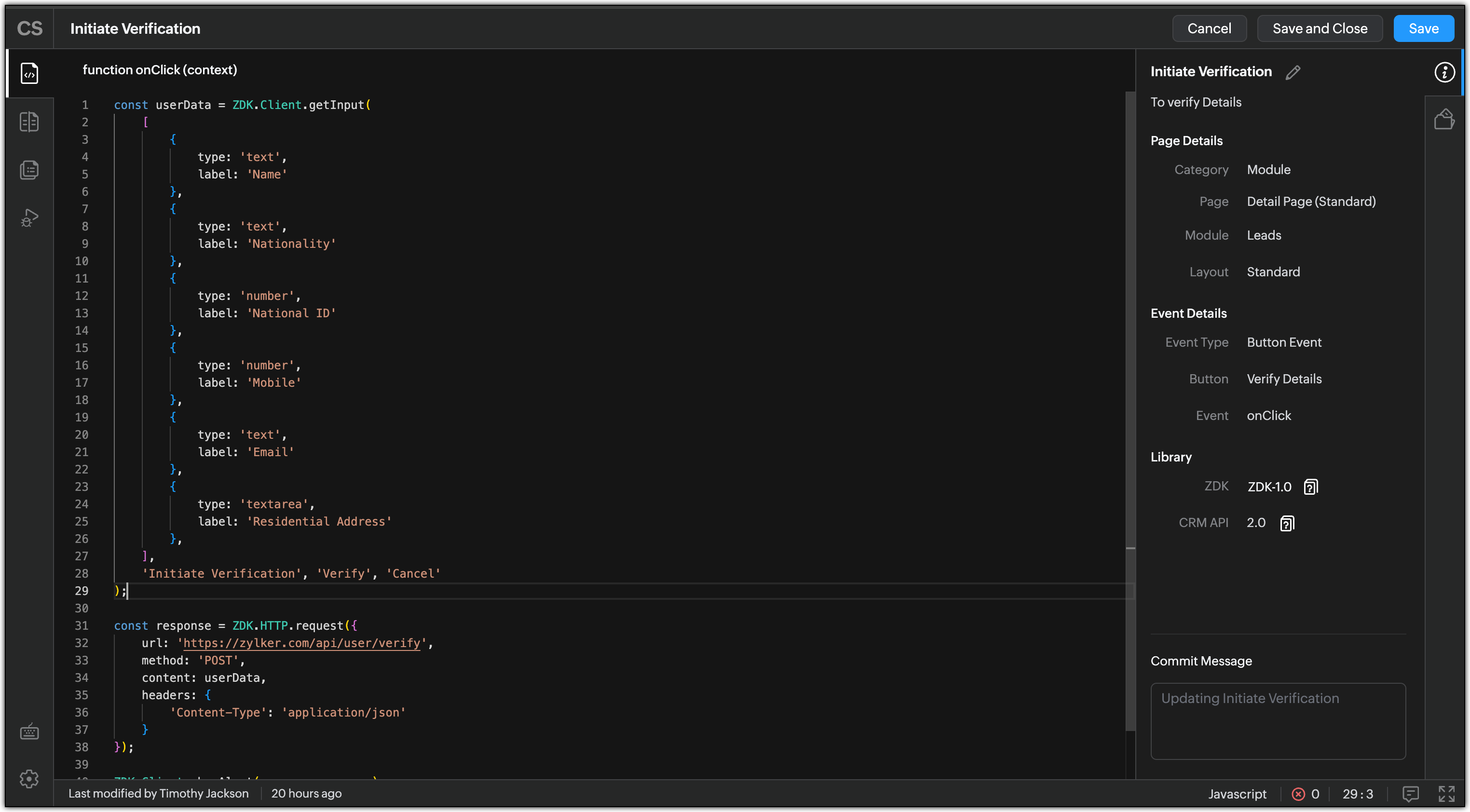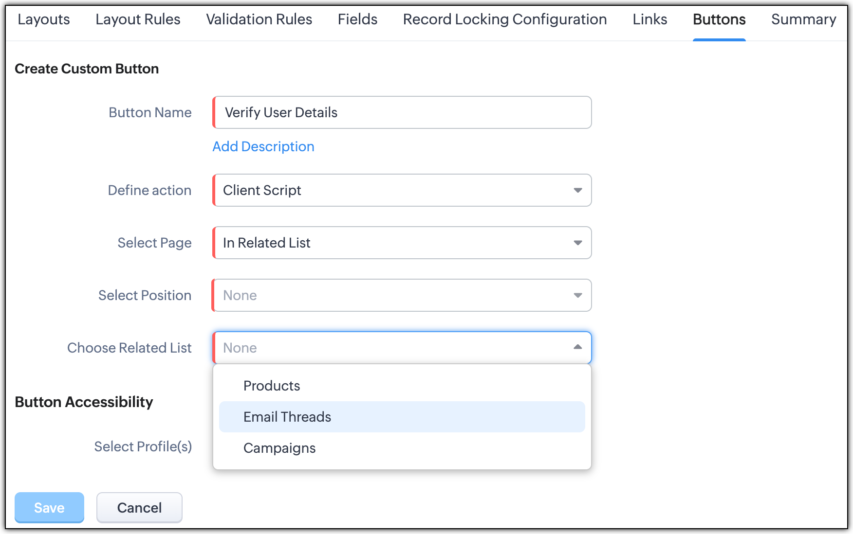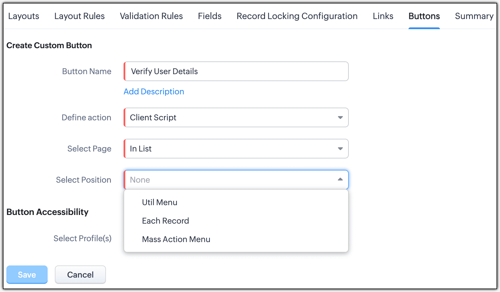 Să presupunem că vrei să verifici detaliile utilizatorului de fiecare dată când un contact este creat; poți configura un client script pentru aceasta și să îl plasezi ca buton de acțiune "Verify User Details" în modulul tău. Urmează pașii de mai jos pentru a configura același lucru în butoanele personalizate.