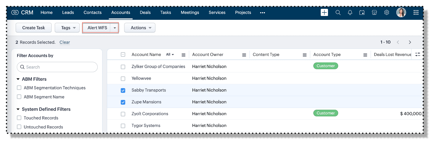 - Regulile de flux de lucru pot fi declanșate și prin funcția personalizată executată din butonul personalizat, folosind sarcinile de integrare CRM API în Deluge Scripting.