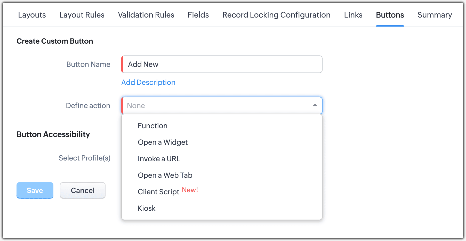 - Definește acțiunea pe care butonul trebuie să o execute. Poți alege să creezi o funcție, să deschizi un widget, să invoci un URL, să deschizi un Web Tab, să creezi un Client Script sau să declanșezi un Kiosk.