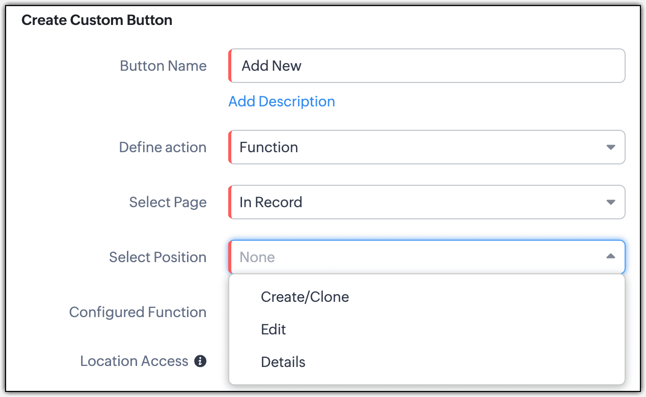 - Dacă ai ales să plasezi butonul în interiorul unei înregistrări, poți alege între Creare/clonare, Editare sau Detalii.