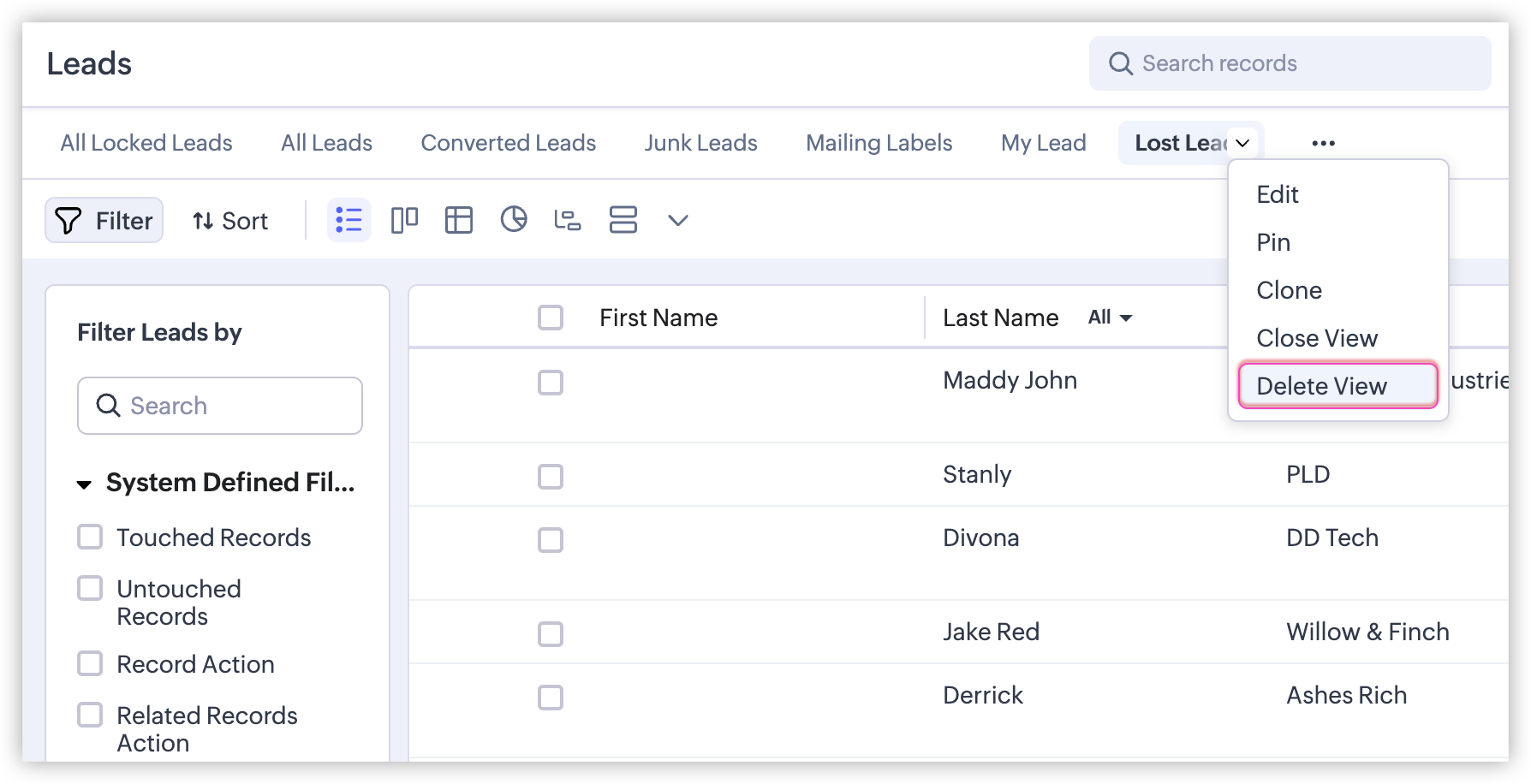 - În fereastra pop-up „Ești sigur că dorești să ștergi vizualizarea personalizată „Lead-uri pierdute"?" , fă clic pe Șterge.