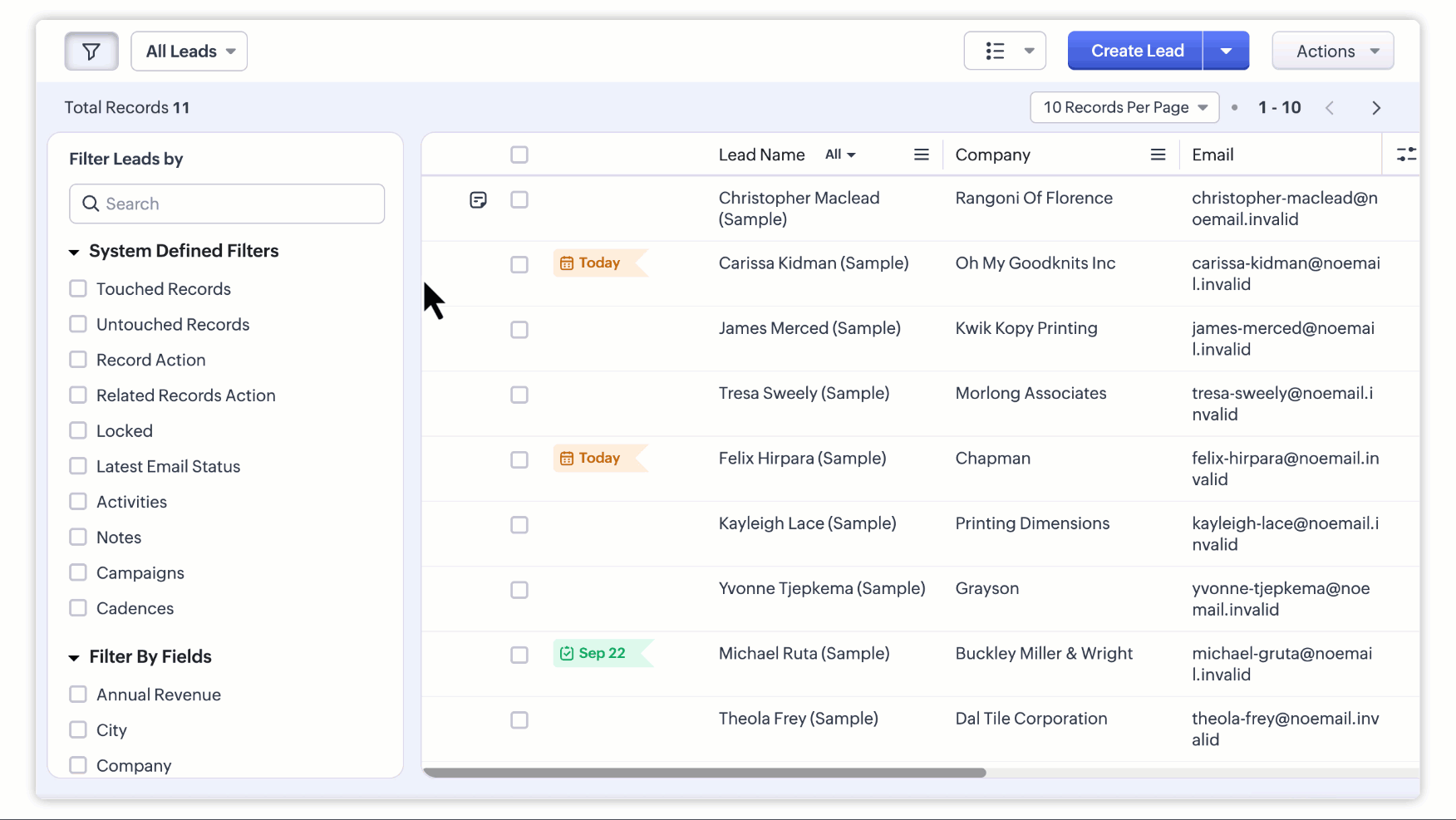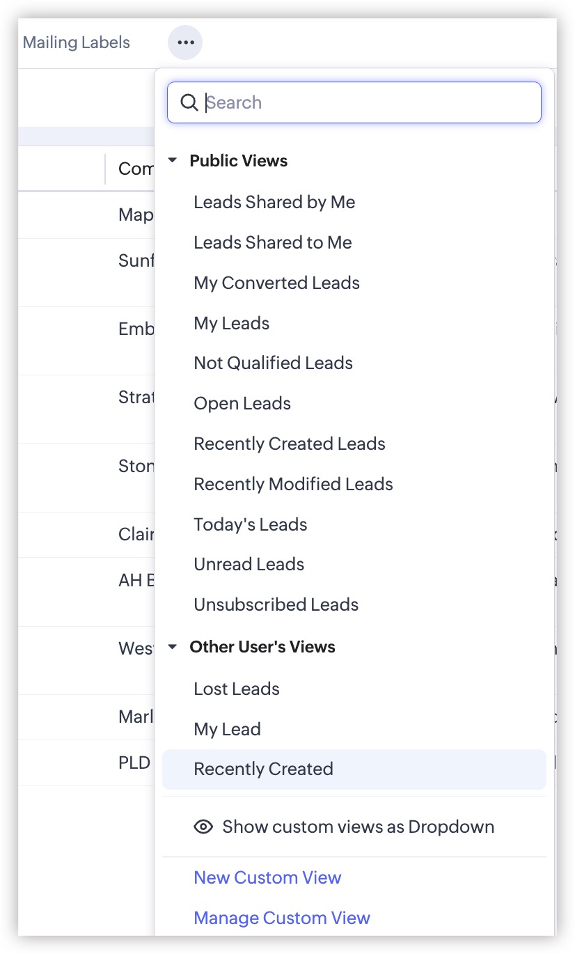 Zoho CRM oferă un set de vizualizări de listă Standard gata de utilizat de toți utilizatorii din organizația ta. În plus, poți crea vizualizări de listă și le poți partaja cu colegii din organizație.
