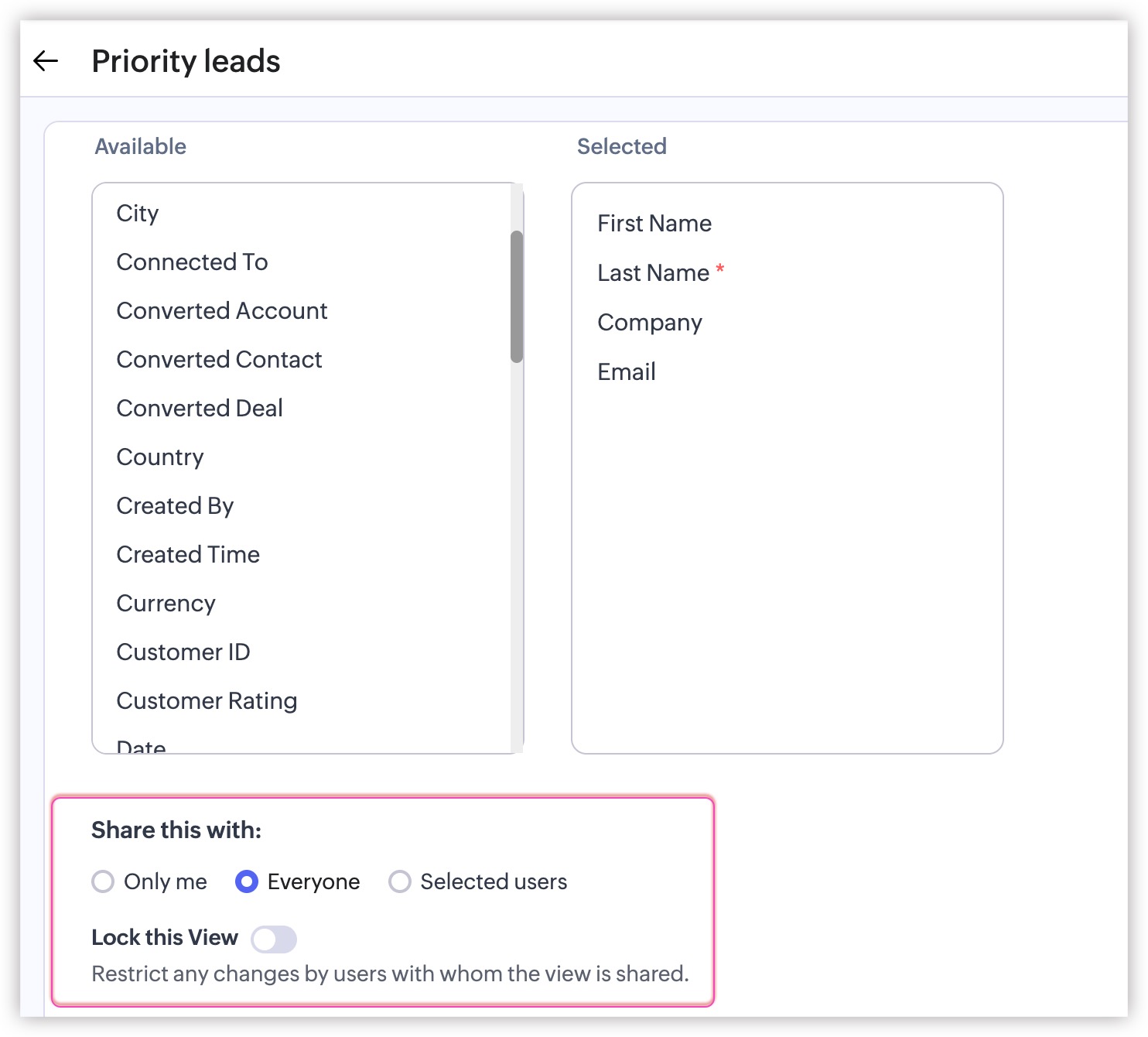 - Vizualizări publice - Vor fi afișate vizualizările accesibile tuturor din contul tău CRM.
