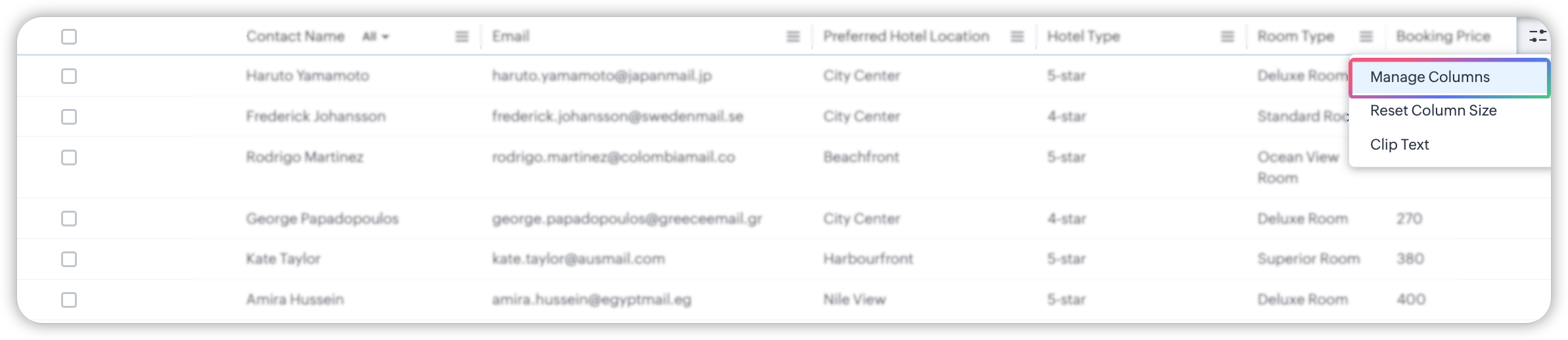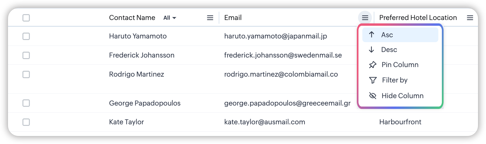 Fiecare coloană are un set de Opțiuni coloană lângă antetul coloanei. Să vedem pe scurt opțiunile: