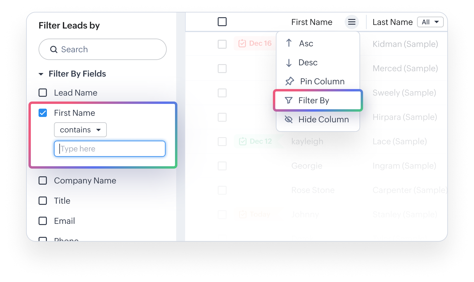 - Filtrează după: Pentru a simplifica procesul de filtrare a înregistrărilor pe baza câmpurilor vizibile. Servește ca scurtătură la panoul din stânga, pe care utilizatorii îl pot folosi în continuare pentru a filtra câmpurile de înregistrări ascunse.