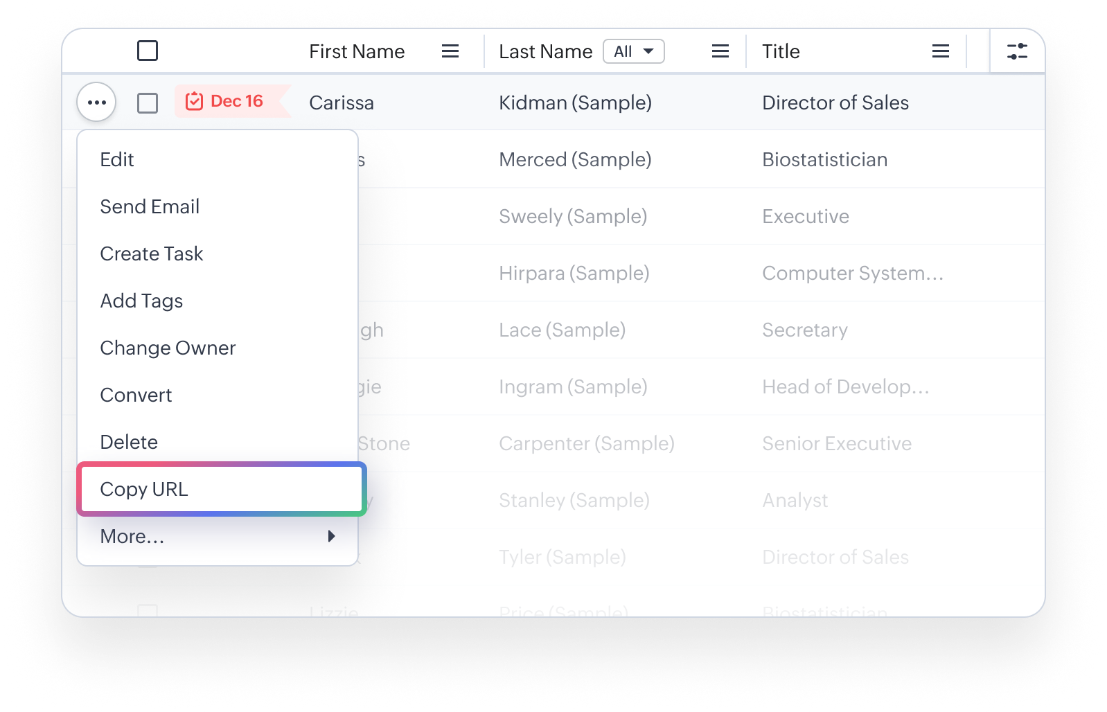 Fiecare înregistrare din fiecare modul are un ID unic în URL-ul său. Opțiunea Copiază URL ajută utilizatorii să copieze URL-ul înregistrării fără a deschide un tab nou. De exemplu, utilizatorii pot folosi opțiunea Copiază URL pentru a insera linkuri în contactele lor dintr-un sistem telefonic atunci când este integrat cu Zoho CRM. În plus, simplifică și accelerează acțiunile personalizate, cum ar fi aprobarea sau respingerea intrărilor.