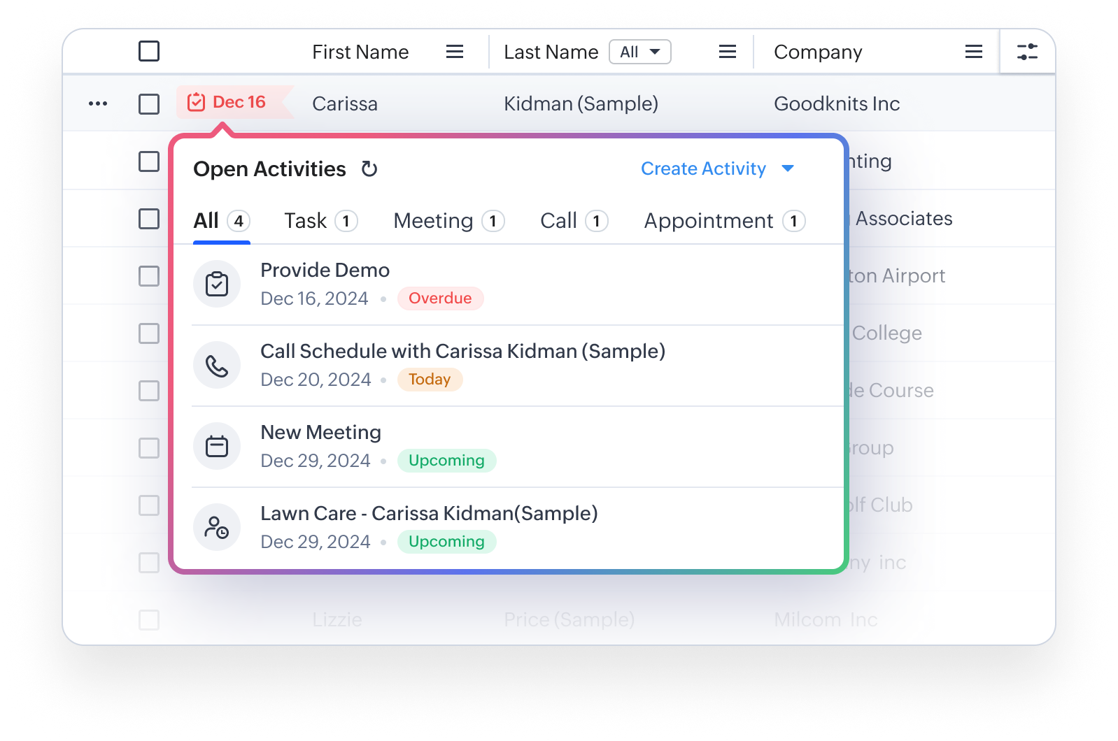 - Adăugarea și actualizarea activităților, adică Sarcini, Întâlniri, Apeluri