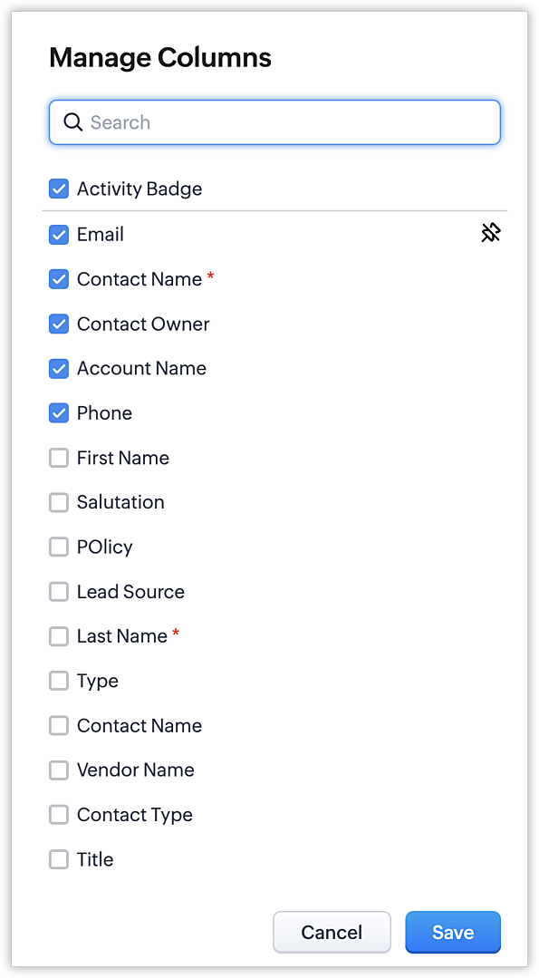 Dacă dorești să adaugi sau să elimini coloane din vizualizarea de listă, poți edita vizualizările de listă standard furnizate implicit în Zoho CRM. Rețineți că nu poți edita criteriile sau redenumi aceste vizualizări de listă predefinite.