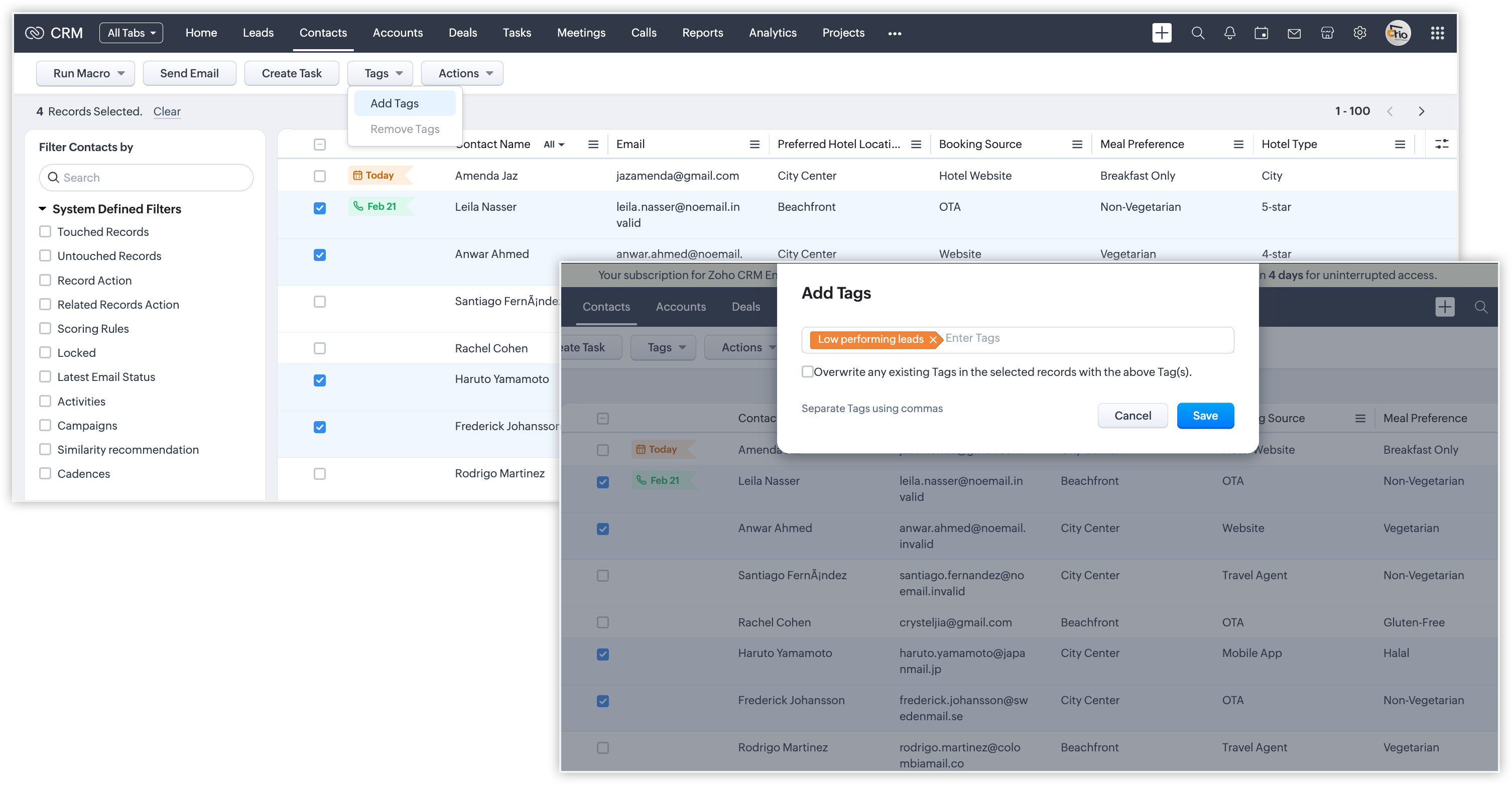 De exemplu, în industria imobiliară, modulul Contacte poate fi conectat la Tranzacții sau Conturi. Folosind criterii inter-module, poți crea vizualizări pentru a vedea contactele care au tranzacții în stadiul 'Negociere', sau contactele legate de programări pentru vizite la proprietăți. Poți identifica, de asemenea, contactele fără tranzacții active, ajutând echipele de vânzări să se concentreze pe lead-urile care pot necesita urmărire.