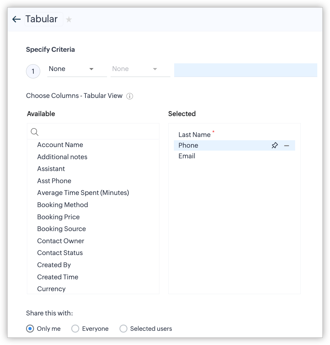 - Poți crea o vizualizare personalizată fără niciun criteriu (adică se alege „Niciunul" pentru criterii). Cu toate acestea, dacă adaugi un câmp sau mai multe câmpuri în criterii, trebuie să specifici opțiunile de criterii cu valorile lor pentru a salva vizualizarea personalizată.