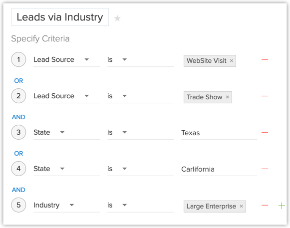 Sursa lead-ului conține „Vizitator website sau Expoziție comercială" și Statul este „California sau Texas" și Sectorul este „Întreprindere mare"