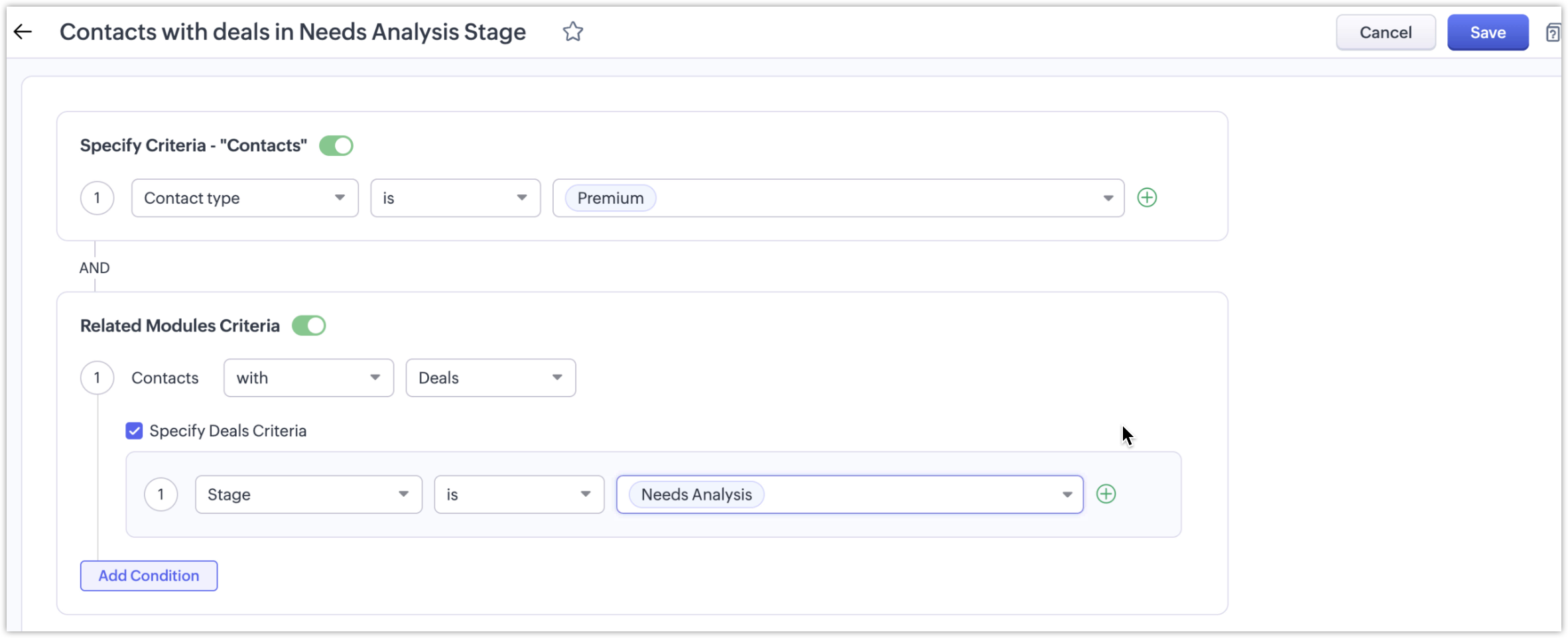 Să presupunem că un utilizator dorește să creeze o vizualizare bazată pe modulul Deals din cadrul modulului Contacts. Ar putea seta câteva dintre următoarele criterii: