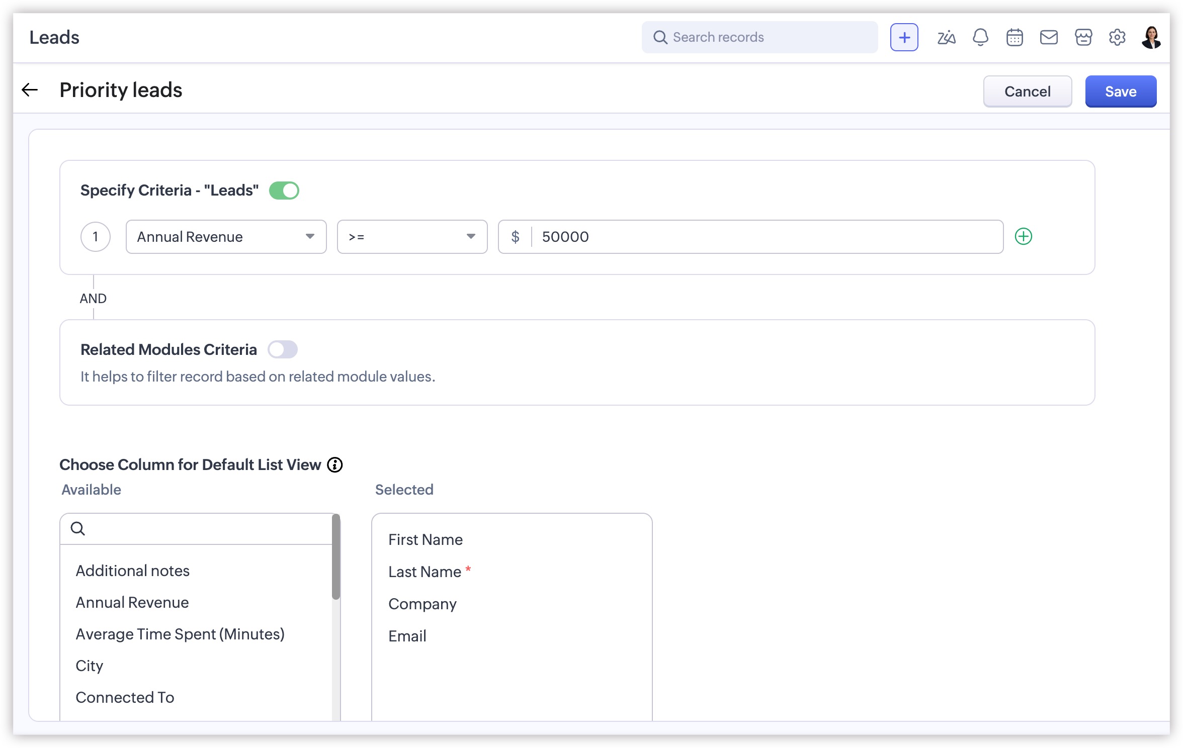 - Poți selecta până la 3 module asociate sau subformulare per vizualizare personalizată și poți aplica până la 3 câmpuri per modul sau subformular. Aceste limite se aplică atât filtrelor inteligente, cât și criteriilor vizualizării personalizate combinate.