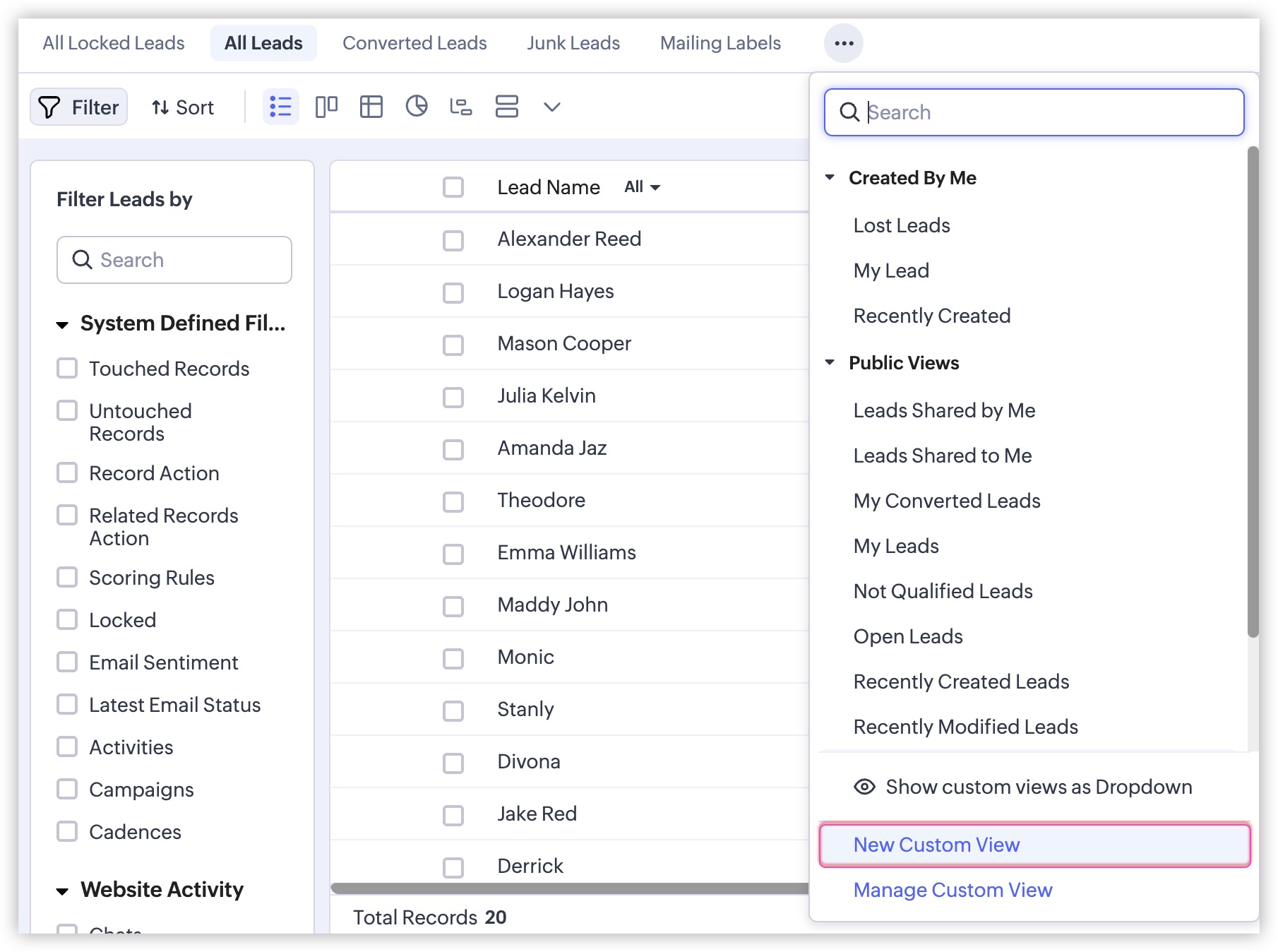 Zoho CRM oferă un set de vizualizări de tip listă Standard care sunt gata de utilizare pentru toți utilizatorii din organizația ta. În plus, poți crea vizualizări de tip listă și le poți partaja cu colegii din organizația ta.