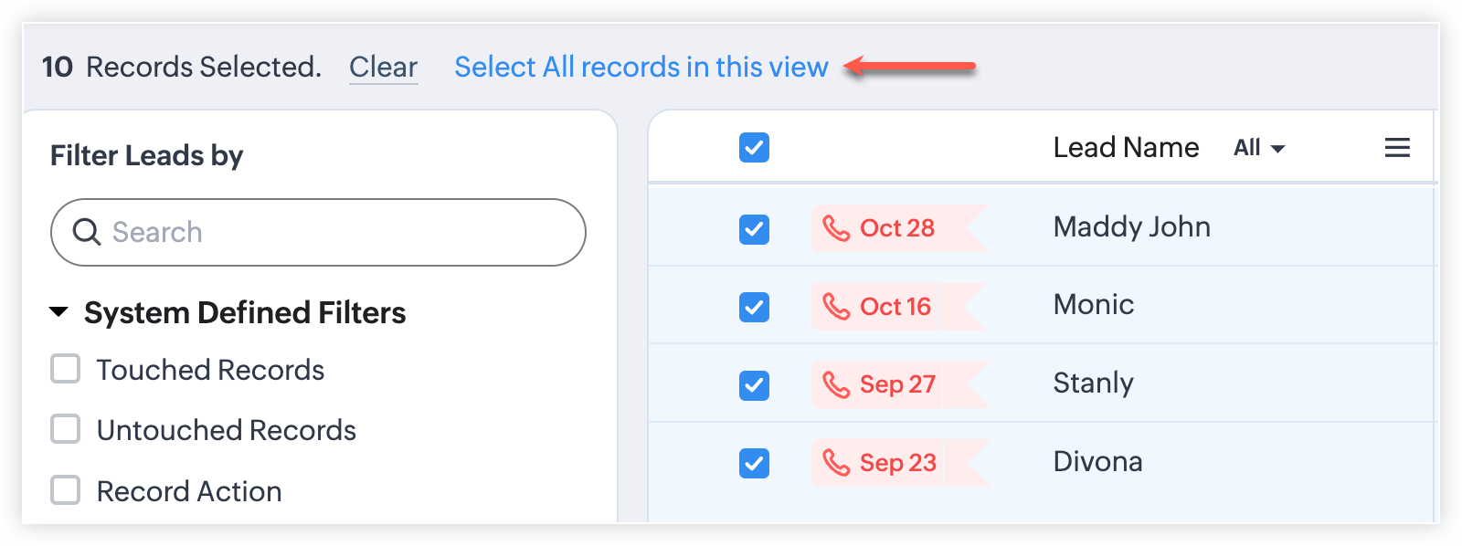 Acestea sunt seturi predefinite de vizualizări de tip listă care sunt gata de utilizare pentru toți utilizatorii din organizație. În funcție de cerințele tale, poți modifica vizualizările standard și sorta ordinea coloanelor din listă. Totuși, vizualizările de tip listă standard nu pot fi șterse. Poți selecta o vizualizare de tip listă din pagina principală a modulului făcând clic pe iconița View. Câteva vizualizări de tip listă standard sunt: All Records, My Records, Recently Created Records, Recently Modified Records, Recently Viewed Records, etc.