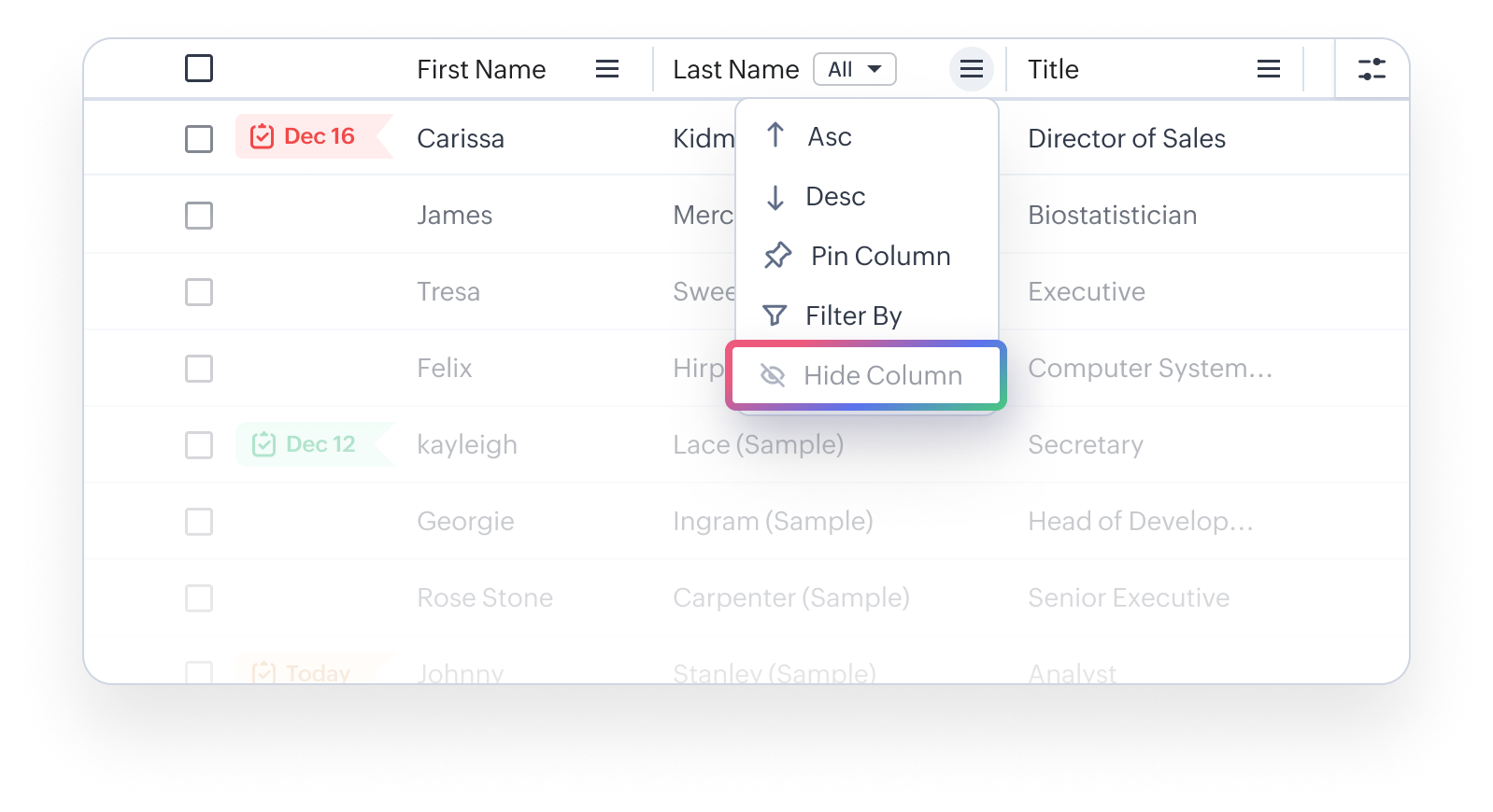 - Ascunde coloana: Pentru a ascunde coloana din vizualizarea de tip listă activă. Este o alternativă ușoară la debifarea numelor coloanelor în Manage Columns. Totuși, doar o singură coloană poate fi ascunsă la un moment dat, iar opțiunea Ascunde coloana pentru o coloană devine dezactivată când acel câmp este singurul câmp obligatoriu implicit rămas în coloanele active ale vizualizării de tip listă.