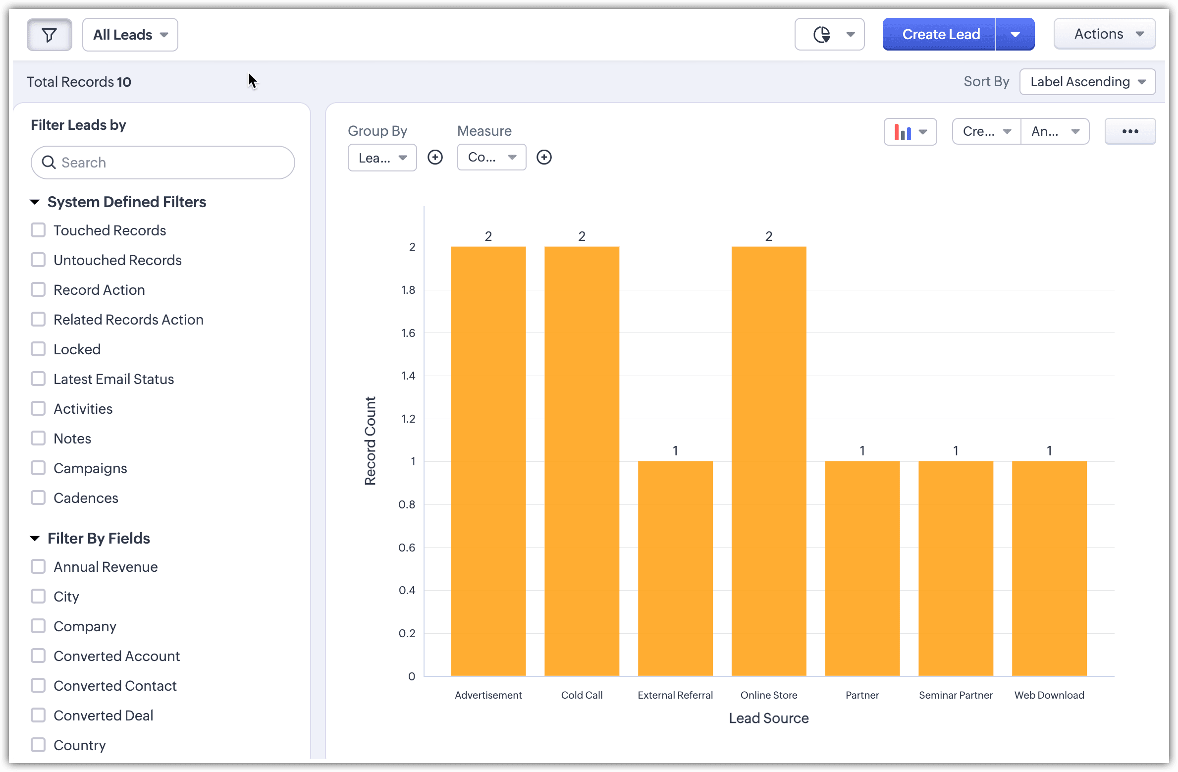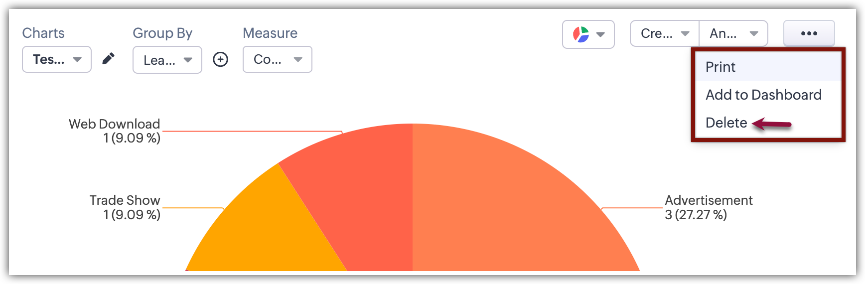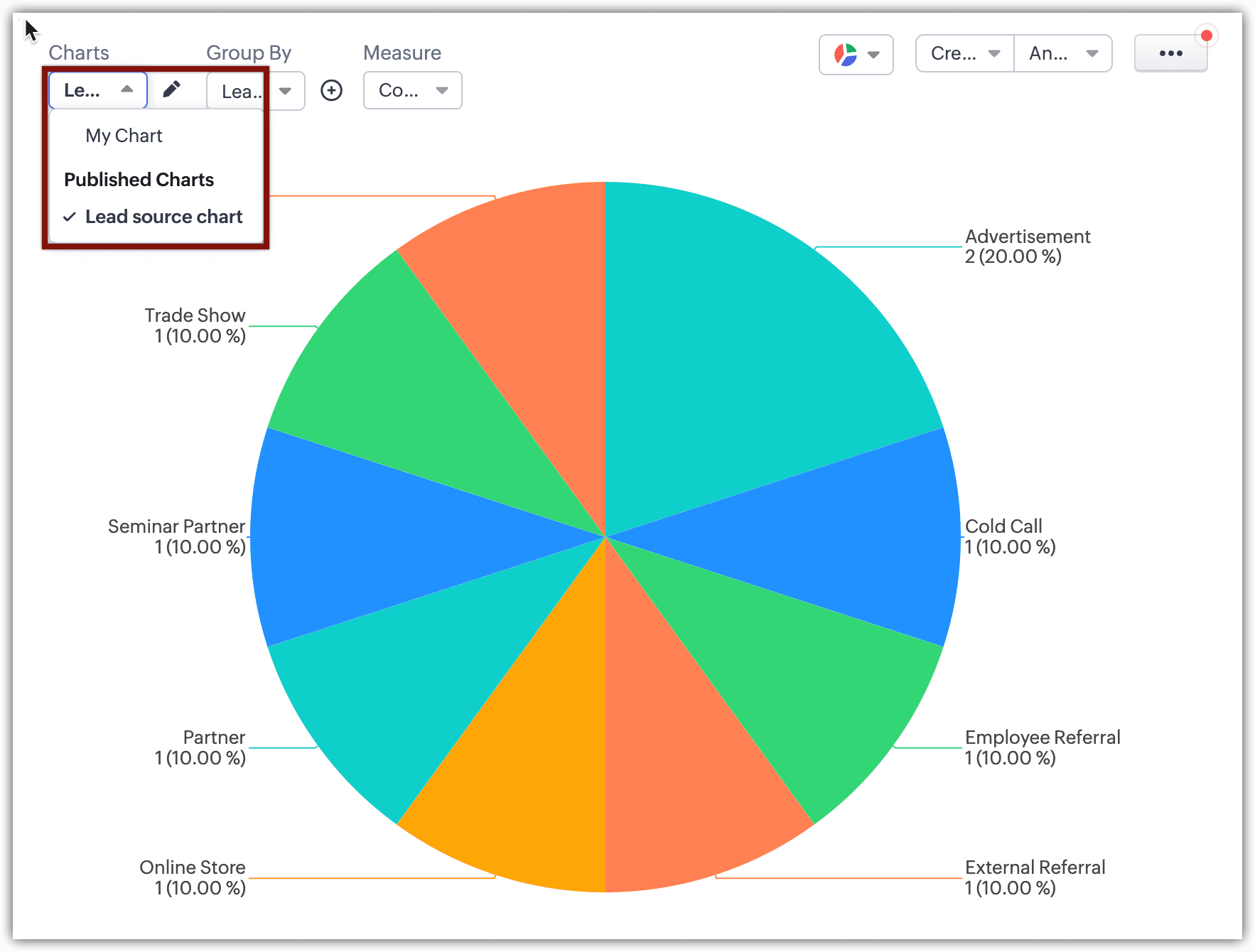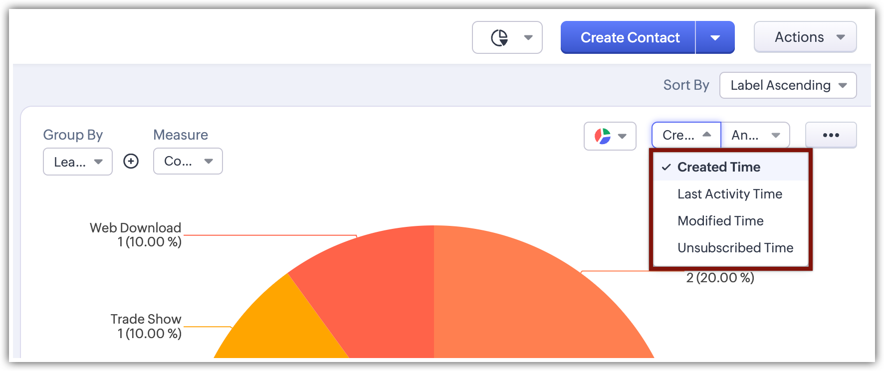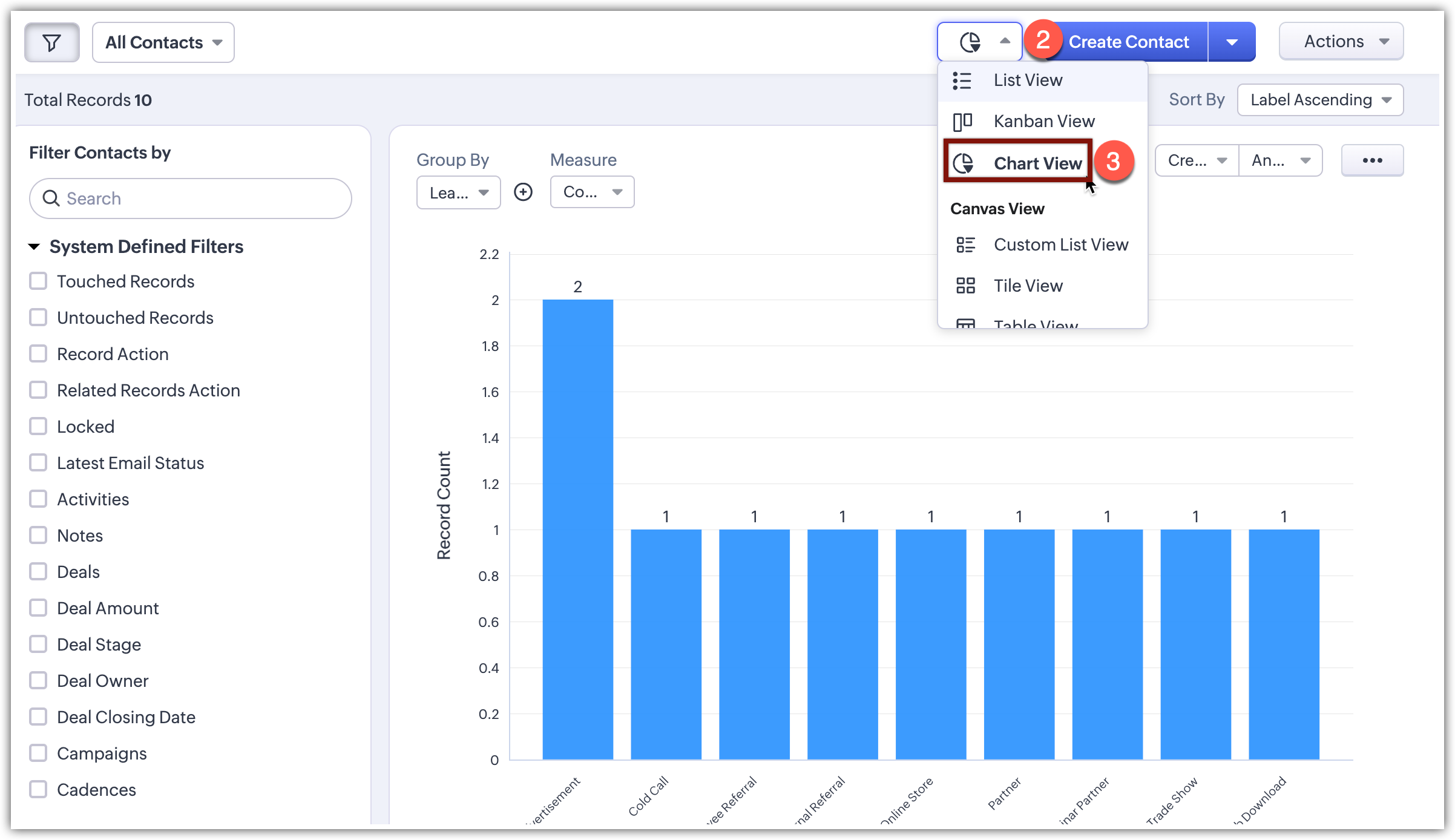 Chart View prezintă datele vizual folosind formate precum diagrame circulare, diagrame cu bare, diagrame cu coloane, diagrame donut și altele. Această funcție îți permite să vizualizezi înregistrările în diferite tipuri de grafice și să aplici filtre pentru a restrânge datele în funcție de nevoile tale, transformând datele brute în grafice intuitive. Funcția îmbunătățește procesul de luare a deciziilor, identifică tipare și tendințe și optimizează strategiile de vânzări în cadrul modulelor CRM. Aceasta elimină necesitatea de a accesa suita de analiză a CRM-ului pentru nevoi simple de vizualizare.