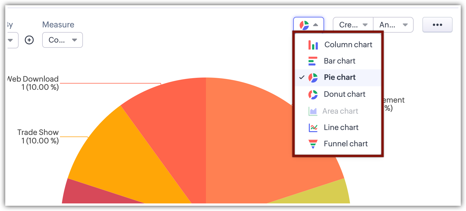 Chart View acceptă mai multe tipuri de reprezentări vizuale, inclusiv diagrame cu coloane, diagrame cu bare, diagrame circulare, diagrame donut, diagrame de suprafață, diagrame liniare și diagrame în pâlnie.