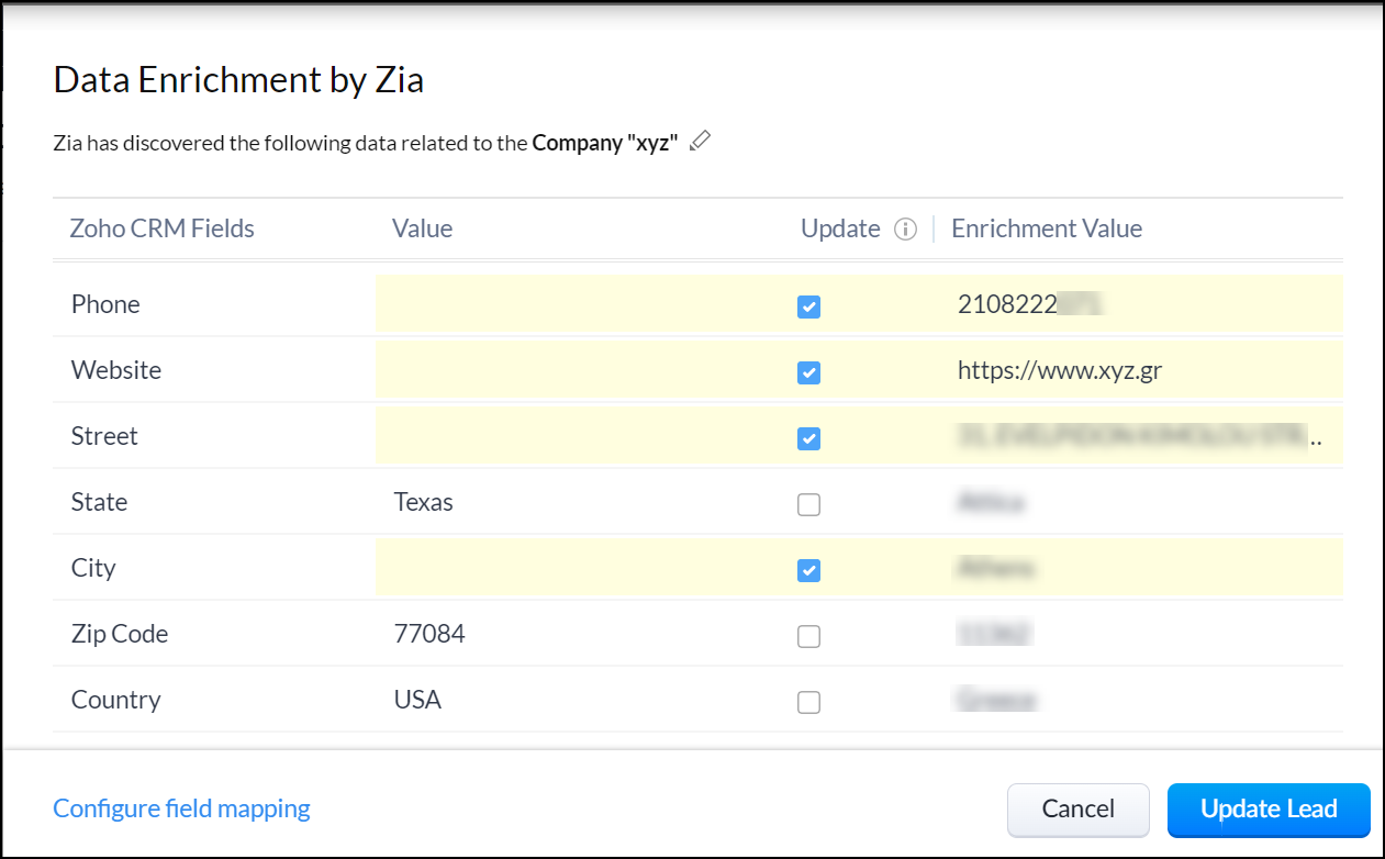 - Activează casetele de selectare din fereastra Data Enrichment by Zia pentru a permite lui Zia să completeze informațiile îmbogățite în câmpurile corespunzătoare.