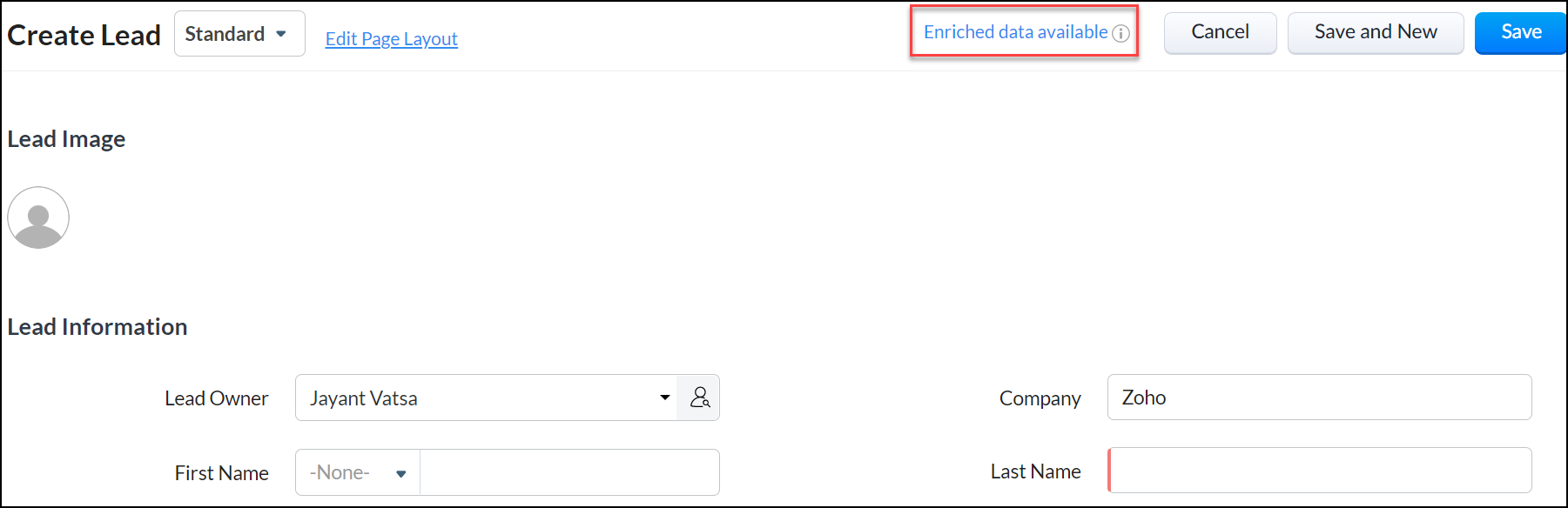 Caseta de selectare este activată automat pentru câmpurile care sunt goale și pentru care există date îmbogățite disponibile. Când Zia preia date îmbogățite pentru câmpuri care nu erau anterior goale, poți alege să păstrezi informațiile existente sau să activezi caseta de selectare și să le suprascrii cu datele îmbogățite. 7. Link-ul Enriched data available nu apare pe pagina de creare a înregistrării. De ce?