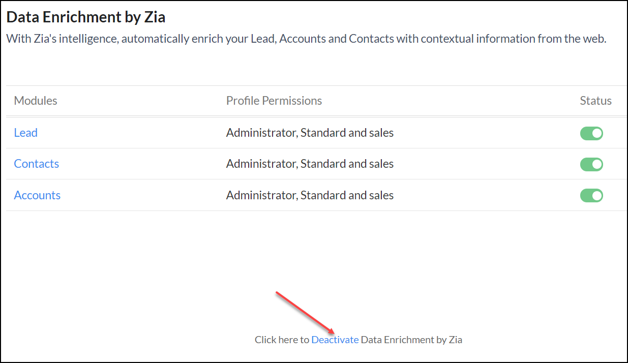 Fă clic pe Deactivate pe pagina Data Enrichment by Zia.
