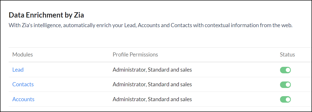 - Vei fi redirecționat către pagina unde poți activa sau dezactiva îmbogățirea datelor pentru modulele Leads, Accounts și Contacts, personaliza setările de îmbogățire a datelor și controla permisiunile de acces pentru această funcție.