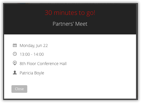 Pop-up-urile de memento pentru întâlniri sunt afișate conform setărilor de întâlnire de pe iPhone și Zoho CRM. Poți crea până la 20 de memento-uri pentru o singură întâlnire. Mai jos sunt capturi de ecran ale memento-urilor de întâlnire din Zoho CRM și de pe câteva dispozitive iOS.