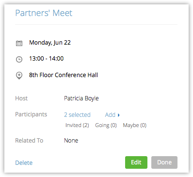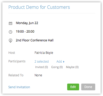 De asemenea, Zoho CRM recunoaște lead-urile/contactele din lista invitaților la întâlnire și le asociază automat ca participanți la întâlnirea sincronizată în Zoho CRM.