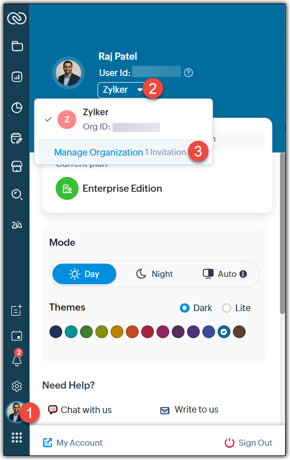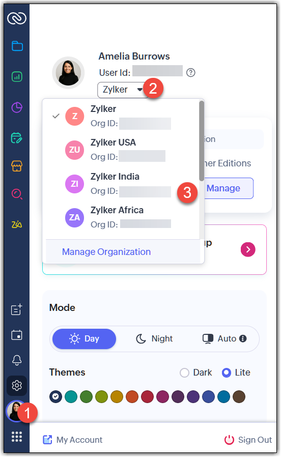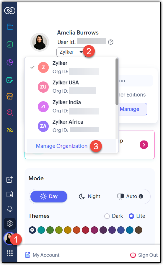 - Lista de organizații: Utilizatorul poate merge la pictograma de profil, apăsa pe săgeata în jos de lângă numele organizației și apăsa pe Manage Organization.