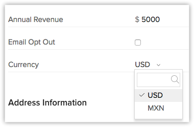 - Creezi un formular web cu câmpul Valută și modifici codul HTML pentru a ascunde câmpul și a furniza o singură valoare pentru câmpul Valută. De exemplu, generezi un formular web cu un câmp ascuns, Valută, a cărui valoare este specificată ca INR. Când formularul este publicat și un vizitator îl completează, suma va fi considerată în INR și va fi adăugată în Zoho CRM.