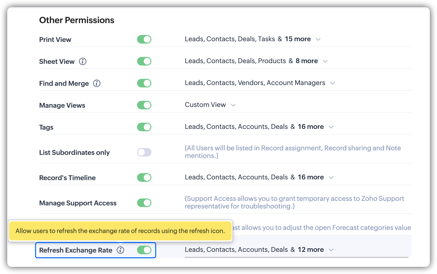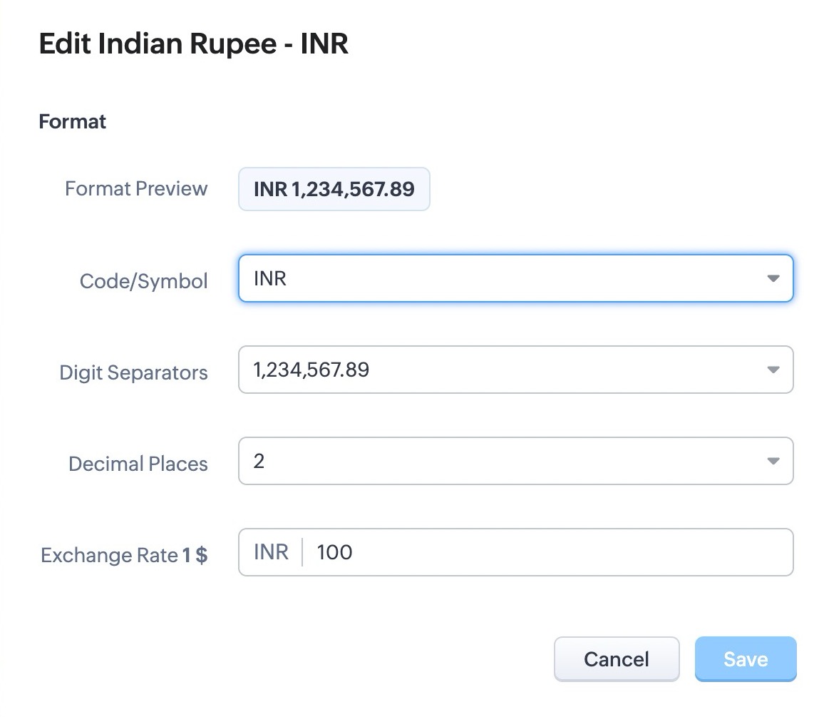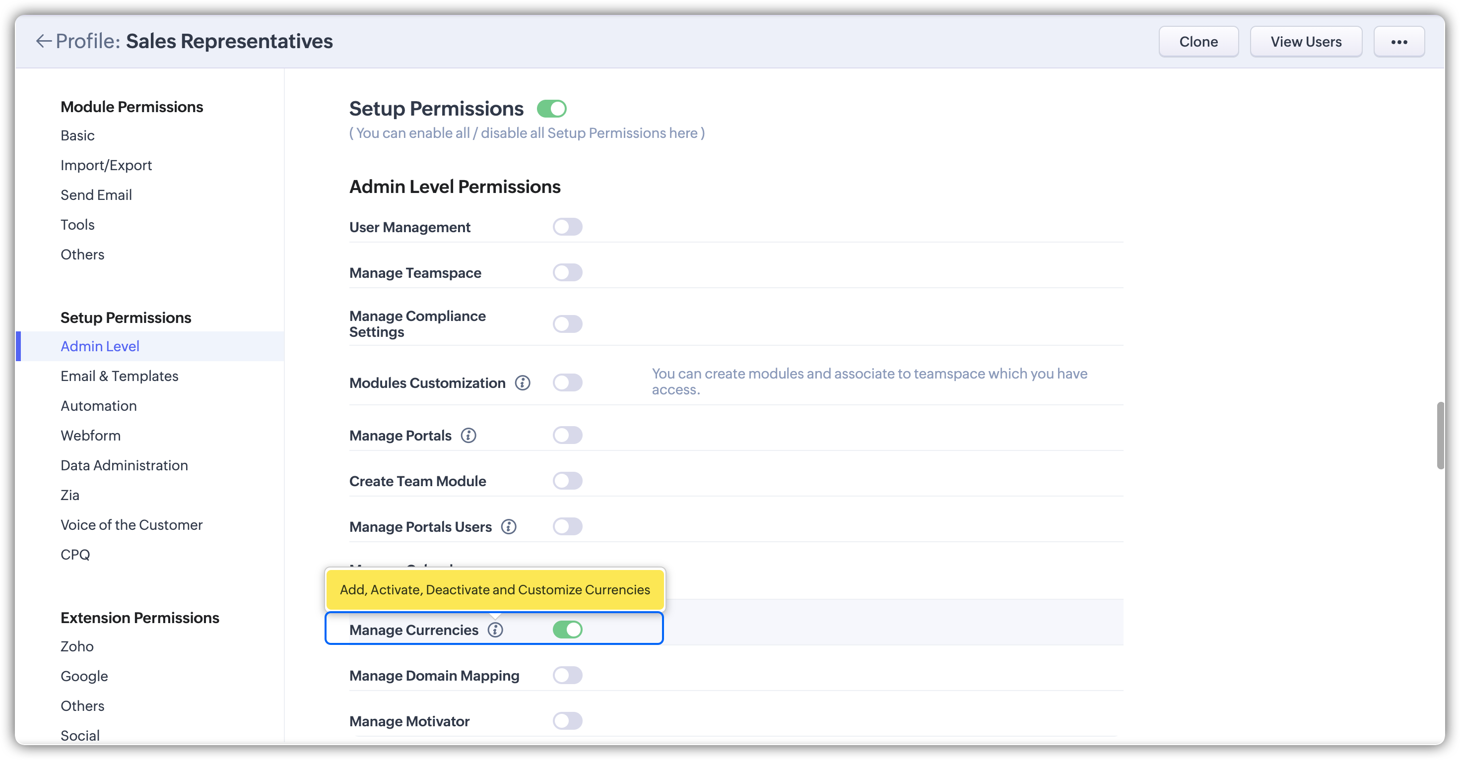 Disponibil în toate edițiile plătite ale Zoho CRM.- Setarea permisiunii necesare pentru a accesa tab-ul Valute este disponibilă în setările de permisiuni la nivel de administrator. Utilizatorii cu permisiunea Gestionare Valute din Permisiuni la Nivel de Administrator pot Adăuga, Activa, Dezactiva și Personaliza valute.