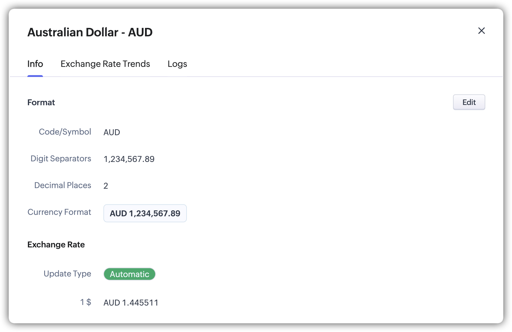 Notă: Pe baza valutei pe care o selectezi, formatul valutei va fi completat automat. - Dacă este necesar, apasă pe Edit pentru a modifica următoarele:
