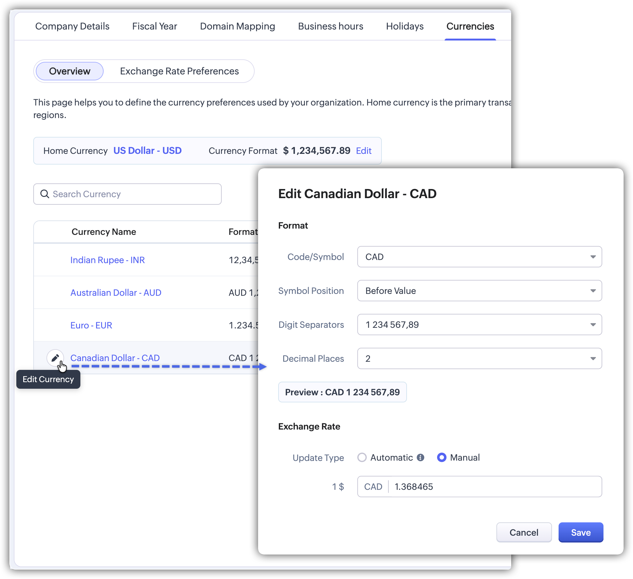 > General > Company Settings > Currencies. - Apasă pe valuta pentru care vrei să schimbi cursul de schimb.