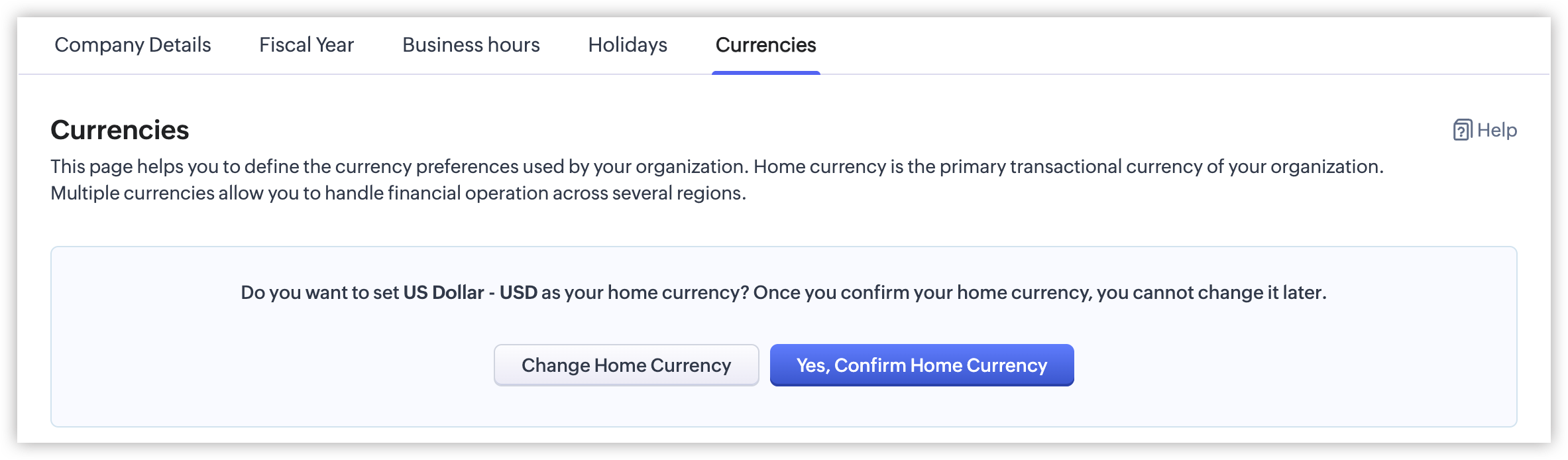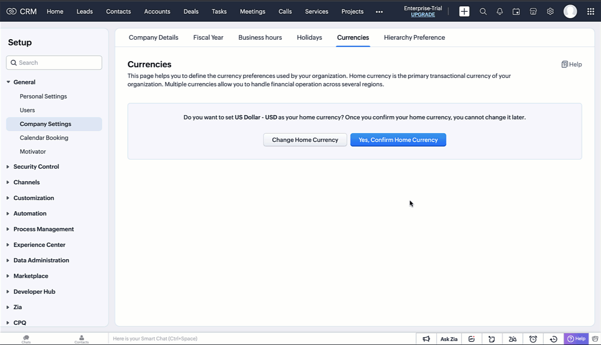 - Apasă pe Change Home Currency dacă vrei să schimbi valuta pe care ai setat-o inițial în timpul configurării CRM-ului.