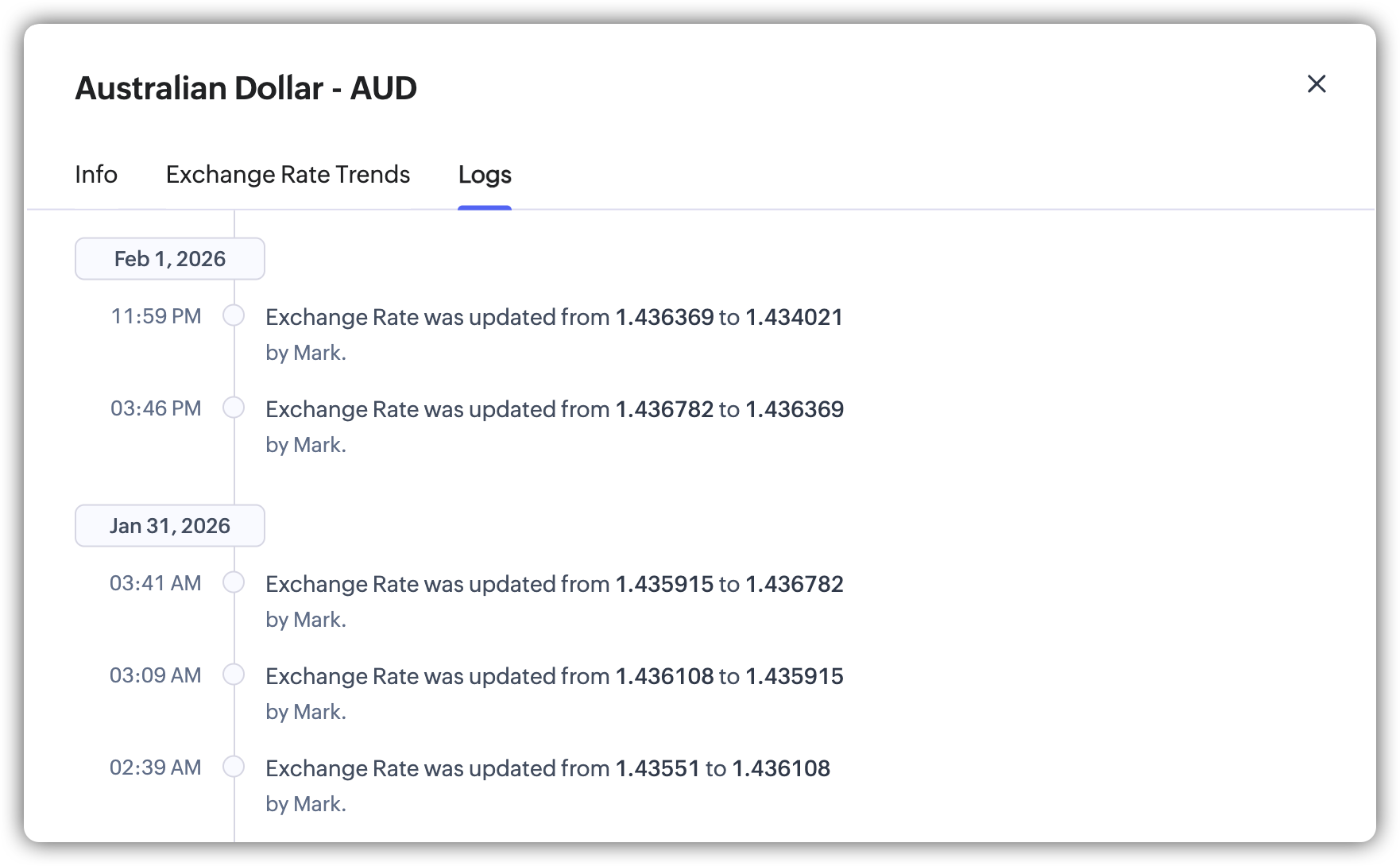 Toate actualizările automate ale cursului de schimb sunt înregistrate în jurnalele valutei.