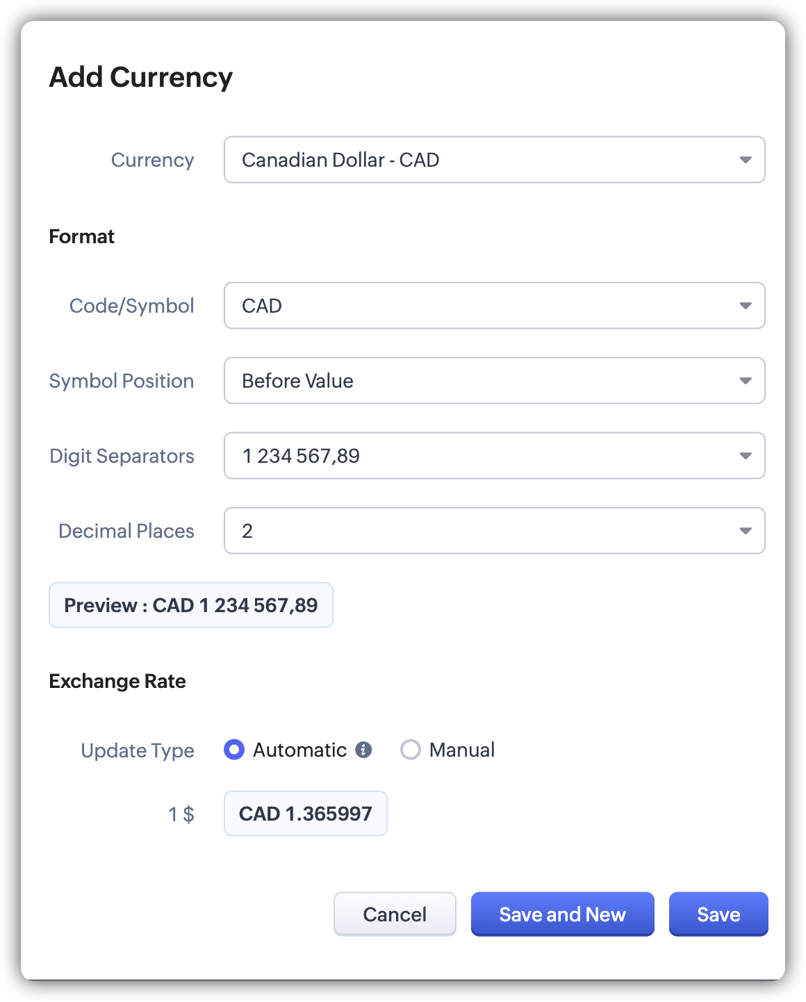 Când o valută este setată pe Automat, cursul de schimb este actualizat automat folosind datele de la Open Exchange Rates, pe baza preferințelor configurate.