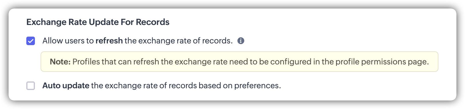 - Mai întâi, poți permite reîmprospătarea manuală la nivel de înregistrare activând Allow users to refresh the exchange rate of records în secțiunea Exchange Rate Update for Records.
