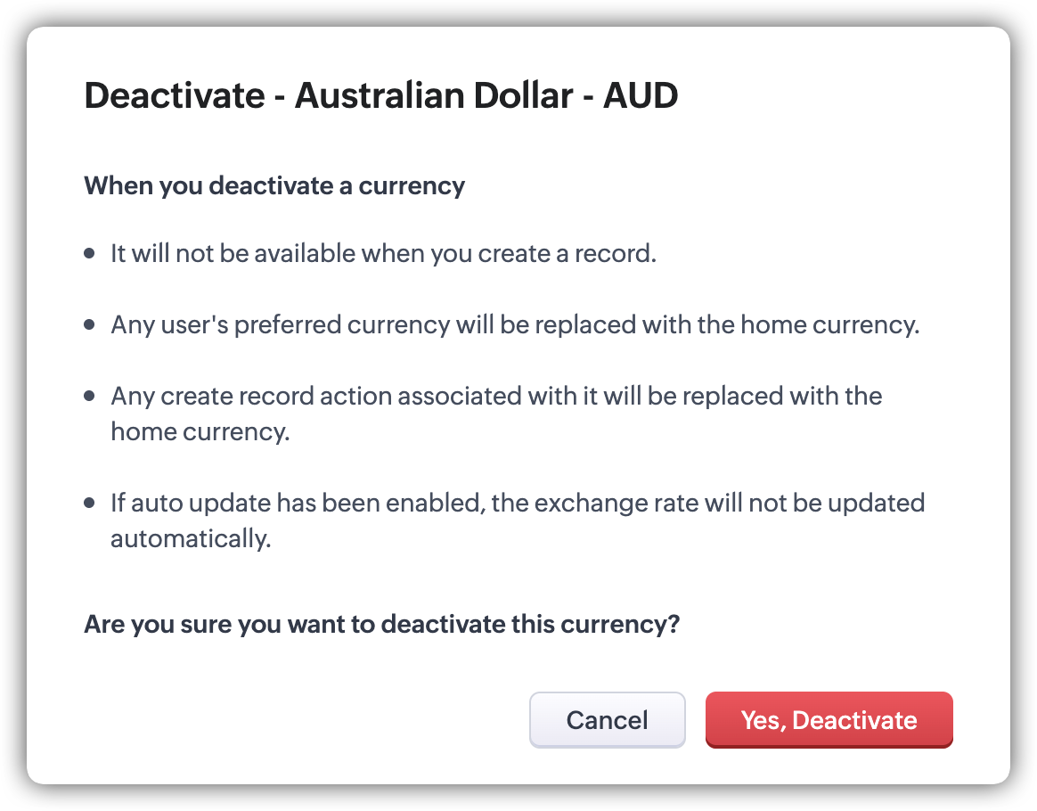 | Conversia înregistrării | Înregistrările care sunt convertite cu valute inactive vor fi înlocuite cu valuta principală, iar valorile câmpurilor valutare vor fi de asemenea convertite pe baza cursului de schimb. În timpul creării tranzacției, o eroare de validare va fi afișată solicitând utilizatorului să aleagă o valută activă dacă câmpul valutei este prezent în formular; în caz contrar, tranzacția va fi creată cu valuta principală. |