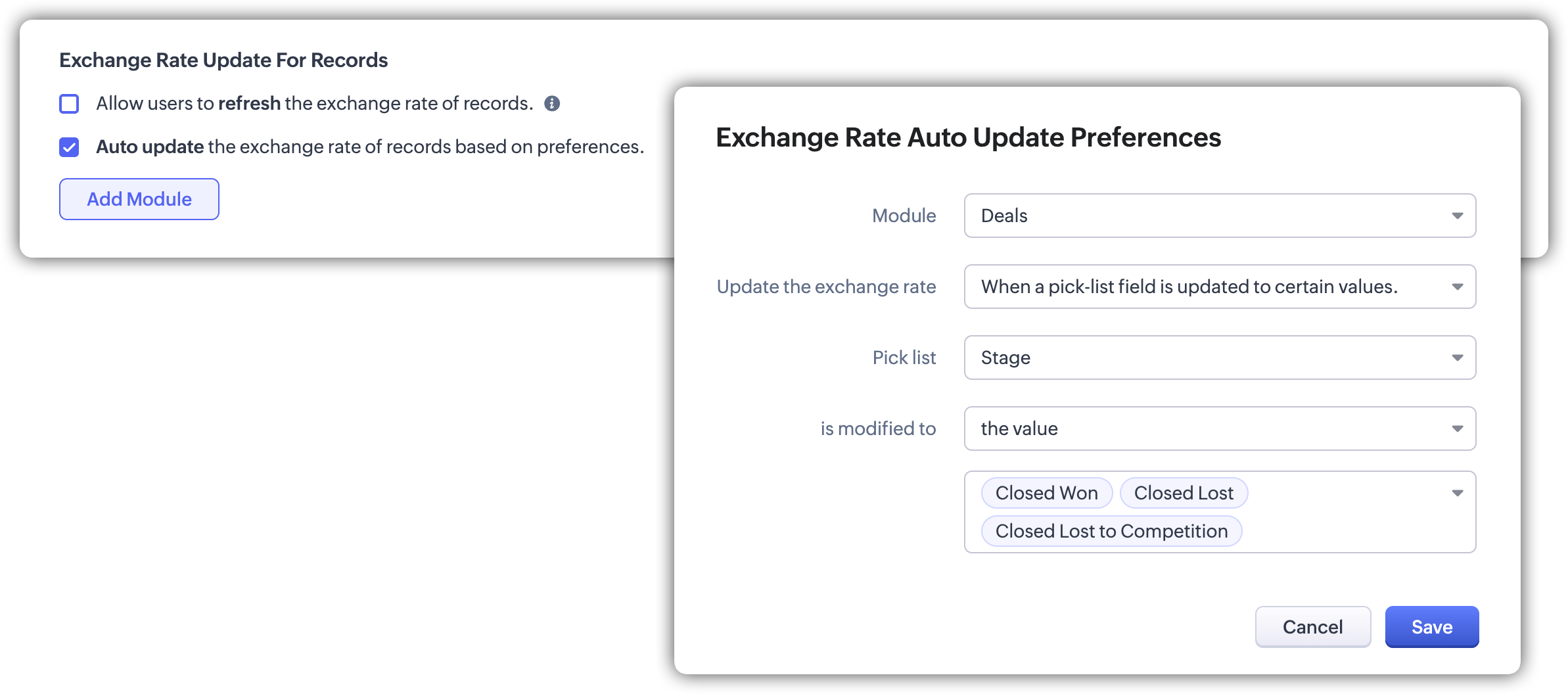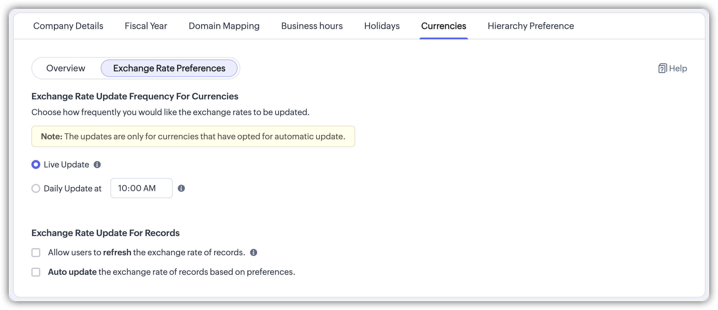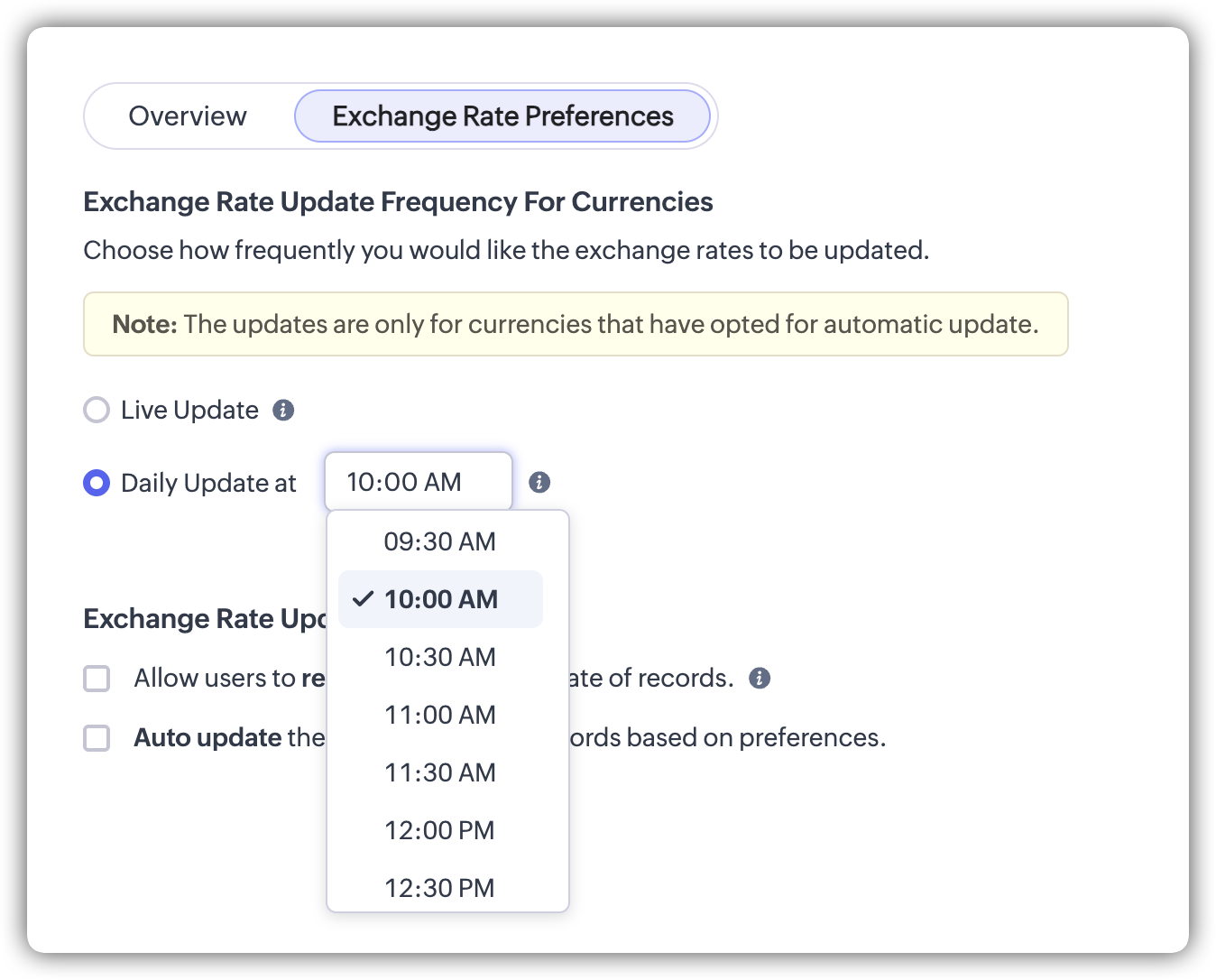 Cursurile de schimb pot fi actualizate automat pentru înregistrări pe baza preferințelor definite. Aceasta permite ca cursul de schimb aplicat unei înregistrări să se schimbe dinamic, în loc să rămână fixat la valoarea capturată la momentul creării înregistrării.