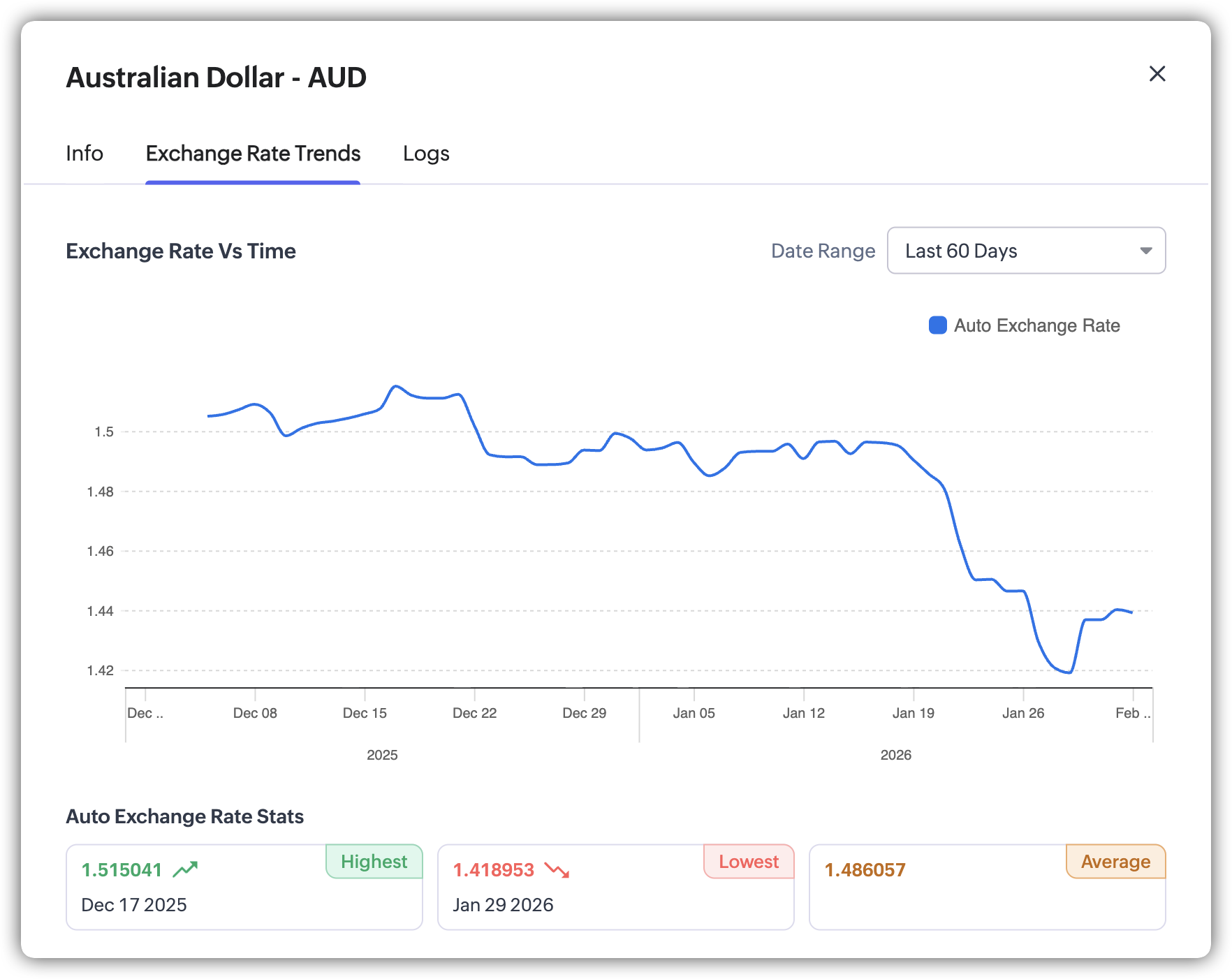 - Tendințe curs de schimb: Fiecare valută suplimentară configurată (în afară de valuta principală) include un grafic cu istoricul cursului de schimb care arată cum s-au schimbat cursurile de schimb în timp față de valuta principală.