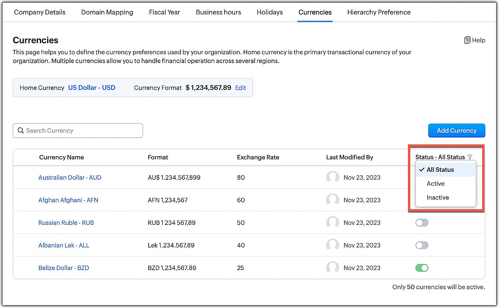 > General > Company Settings > Currencies. - Comută butonul Status pe starea inactivă pentru valuta pe care organizația nu o mai folosește.