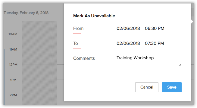 Poți să te marchezi ca indisponibil pentru o anumită perioadă a zilei în calendarul Zoho CRM; astfel, utilizatorul va fi alertat despre indisponibilitatea ta dacă un eveniment este creat pentru acel interval.