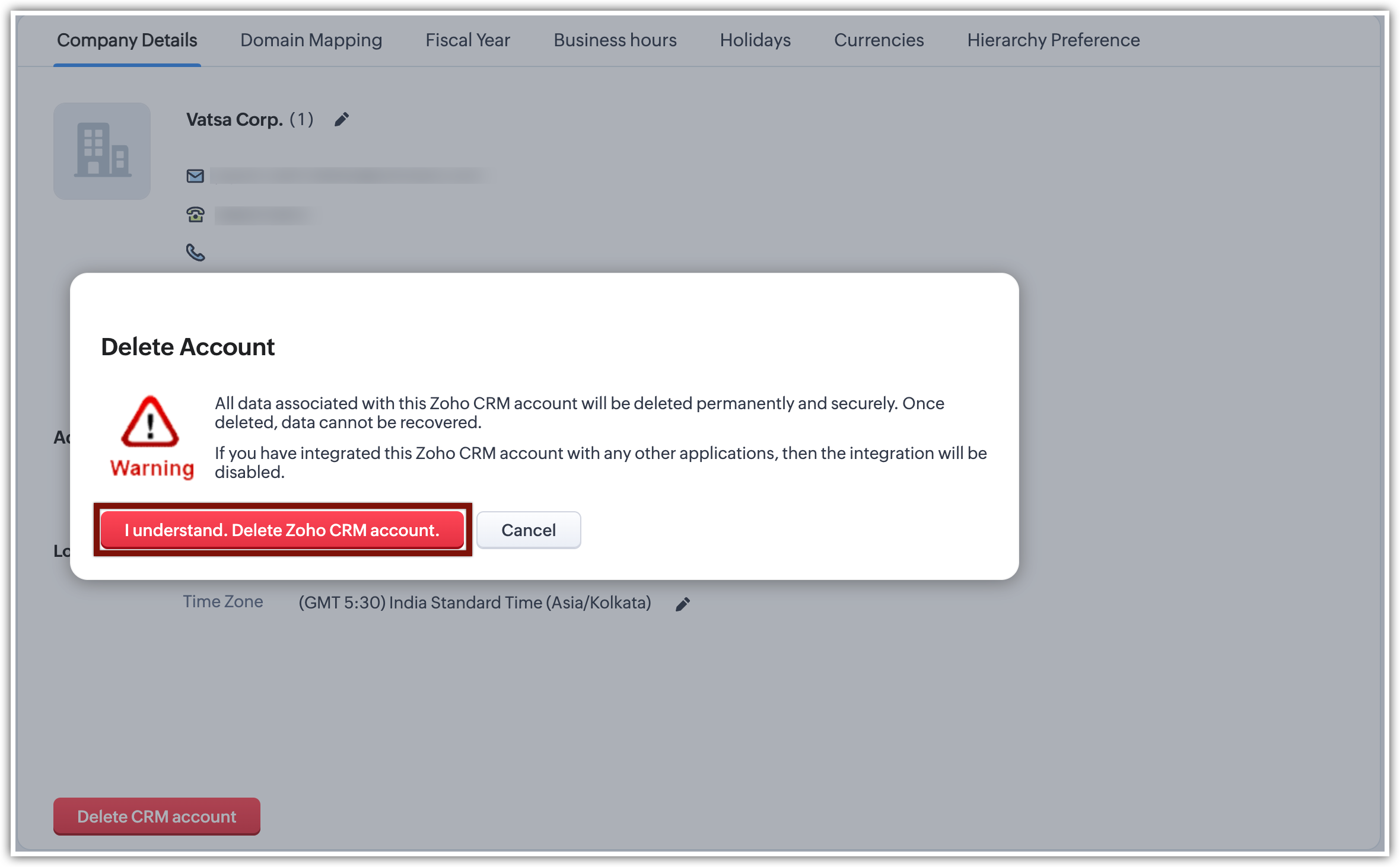 Orice circumstanță care te determină să întrerupi serviciul Zoho CRM sau să ștergi un cont nefolosit îți permite să ștergi contul CRM. De asemenea, dacă un angajat nu mai folosește contul CRM al organizației, poți fie să îl dezactivezi, fie să îl ștergi.